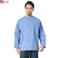 着脱が容易で、横になった際に肌に負担のかからないスナップボタンを使用したノーカラーのスリーピングシャツは、背中に印字されたMEDICAL CENTERの通り、患者の着用するパジャマシャツとなっています。