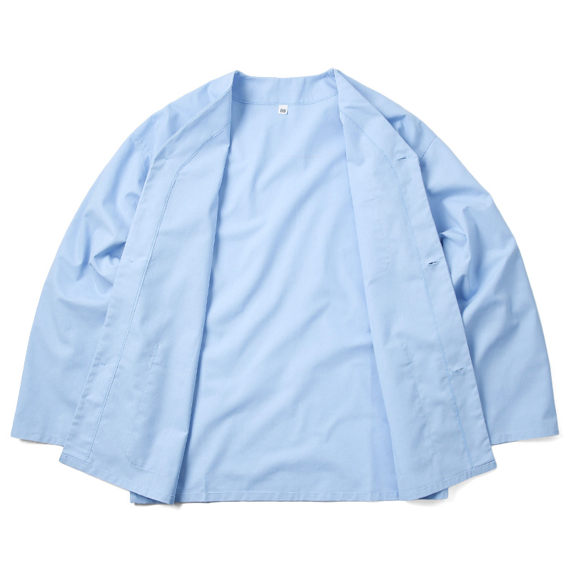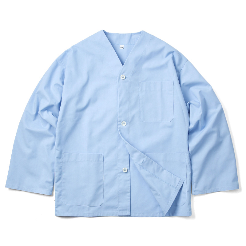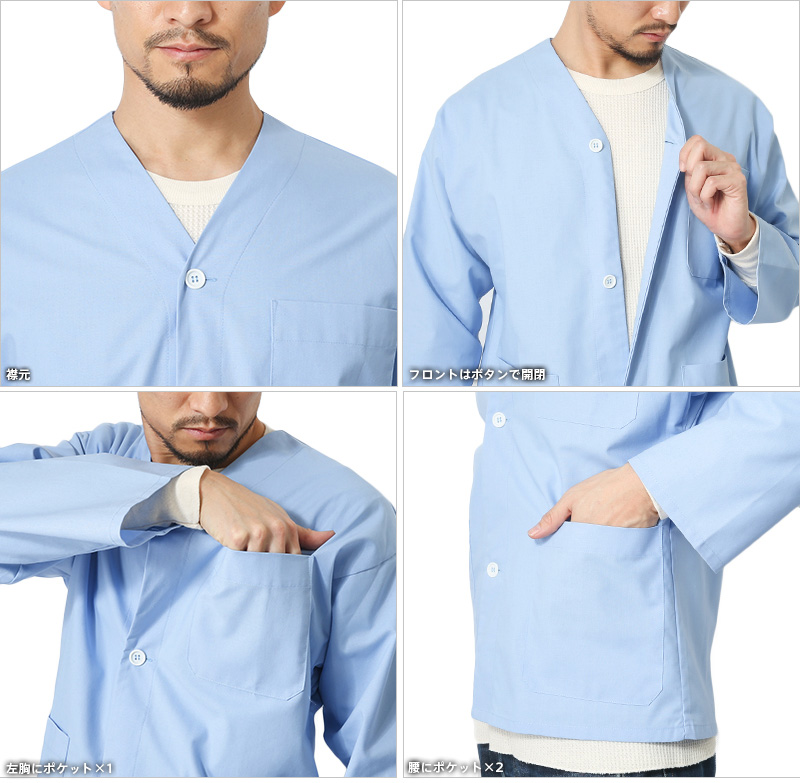 ポケットは胸1つ、サイド2つの計3つあり、Vネックでボタンが3つのシンプルな仕様です。