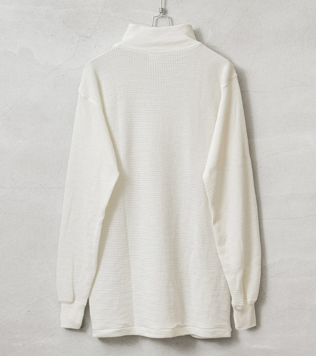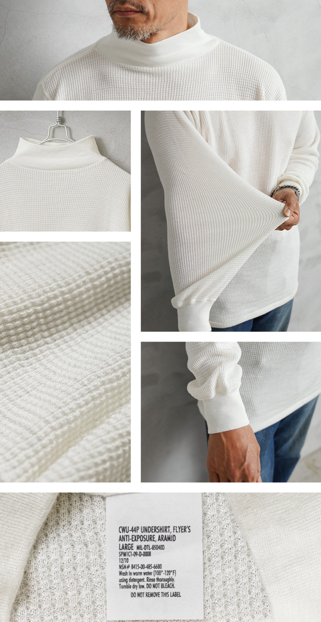 | 商品説明 | 実物 新品 デッドストック 米軍 U.S.A.F. CWU-44 / P フライヤーズ アラミド アンダーシャツのご紹介です。 制式名称:CWU-44/P UNDERSHIRT,FLYER’S ANTI-EXPOSURE,ARAMID 米空軍のエアクルー用のCWU-44Pフライヤーズ アラミド(NOMEX)アンダーシャツがデッドストックで入荷いたしました。 見た目は極シンプルなサーマルですが、素材はなんとアラミド繊維!難燃繊維であるNOMEXに使用されている糸と同じで火が燃え移りにくい素材となっています。 非常に軽くコットンライクな質感でやわらかい着心地も魅力です。 シンプルな見た目と機能的な作りは男心をくすぐる一着。あのS.マックイーンも映画『栄光のルマン』で同モデルを着用したとも言われ、 近年手に入れるのが難しいアイテムです。 ワッフル編みにモックネックデザインというルックスの良さで、レイヤードスタイルはもちろん1枚での着用もオススメです。 |