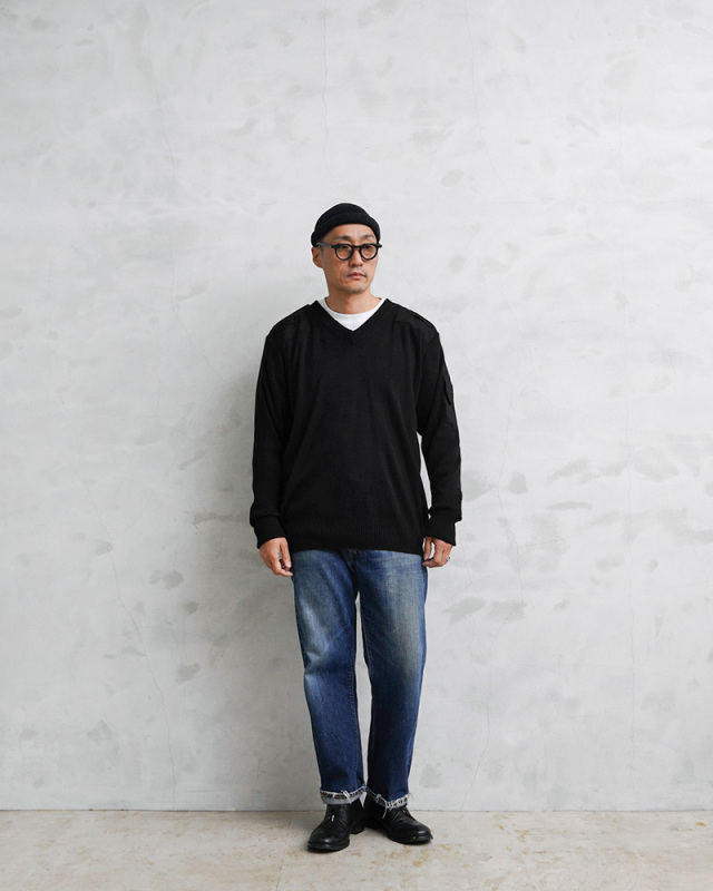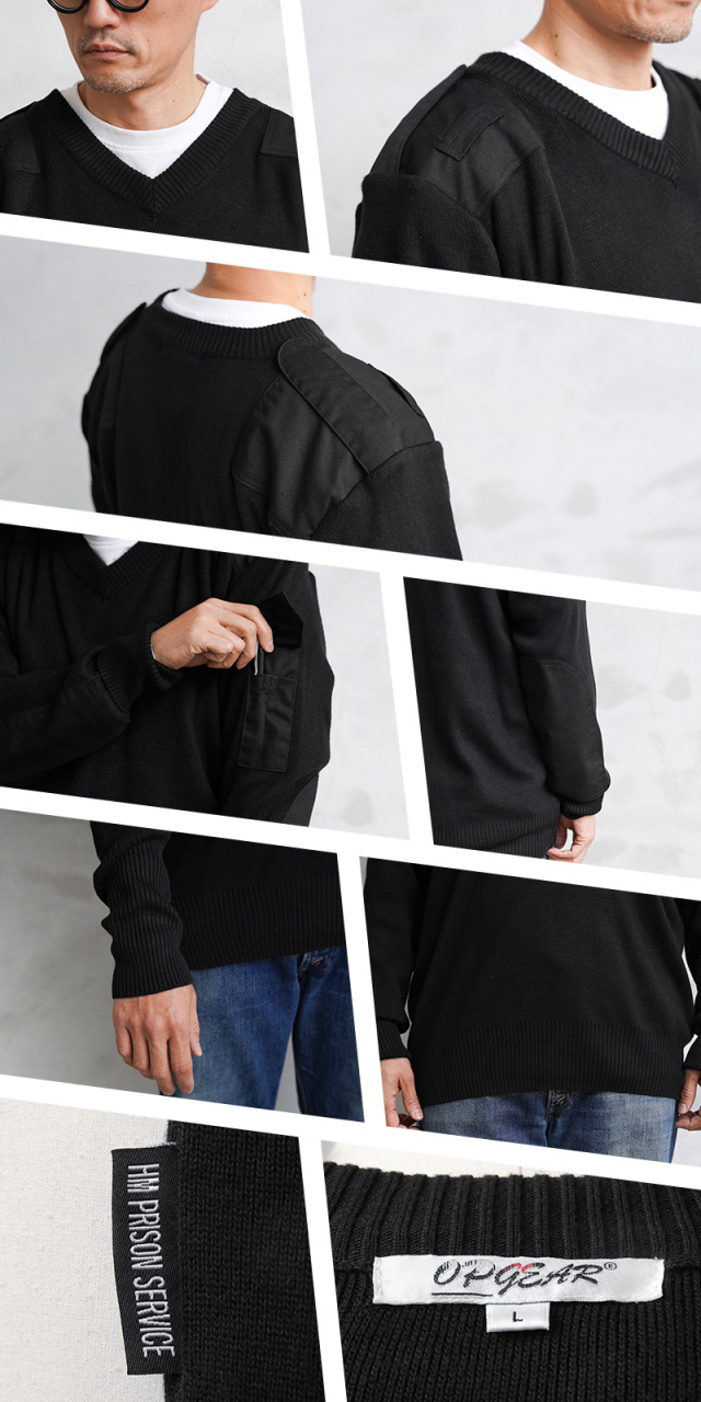 イギリスの刑務所で実際に刑務官が着用するセーター。 首元をすっきりと見せることができるVネックで、ニットに負担の掛かりやすい肩、肘には当て布が施され、左腕にはペンポケットも備えています。 肩にはエポレットや無線用コールを付けるループも付いています。 しっかりと編まれたニットと、飽きのこないデザイン。首元が広い分インナーとのレイヤードスタイルを構築しやすいVネックラインで、着回し力の高いおすすめのアイテムです。 |