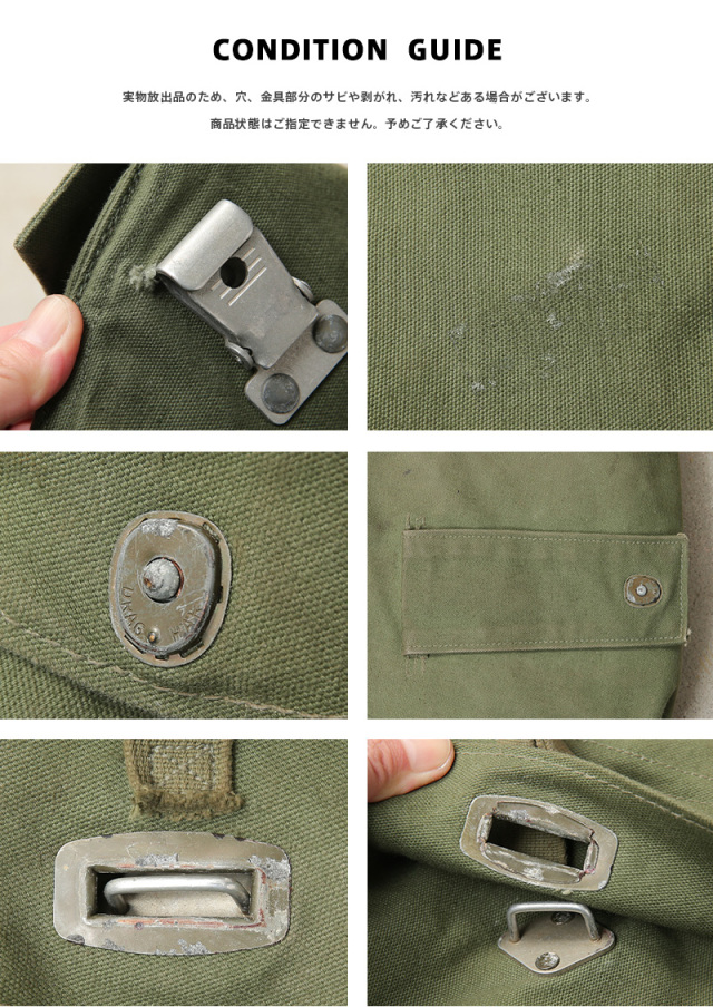 | 商品状態 | 軍放出のUSED ※こちらの商品はUSED品です。穴、金具部分のサビや剥がれ、汚れなどがある場合がございます。商品状態はご指定できません。予めご了承ください。 |