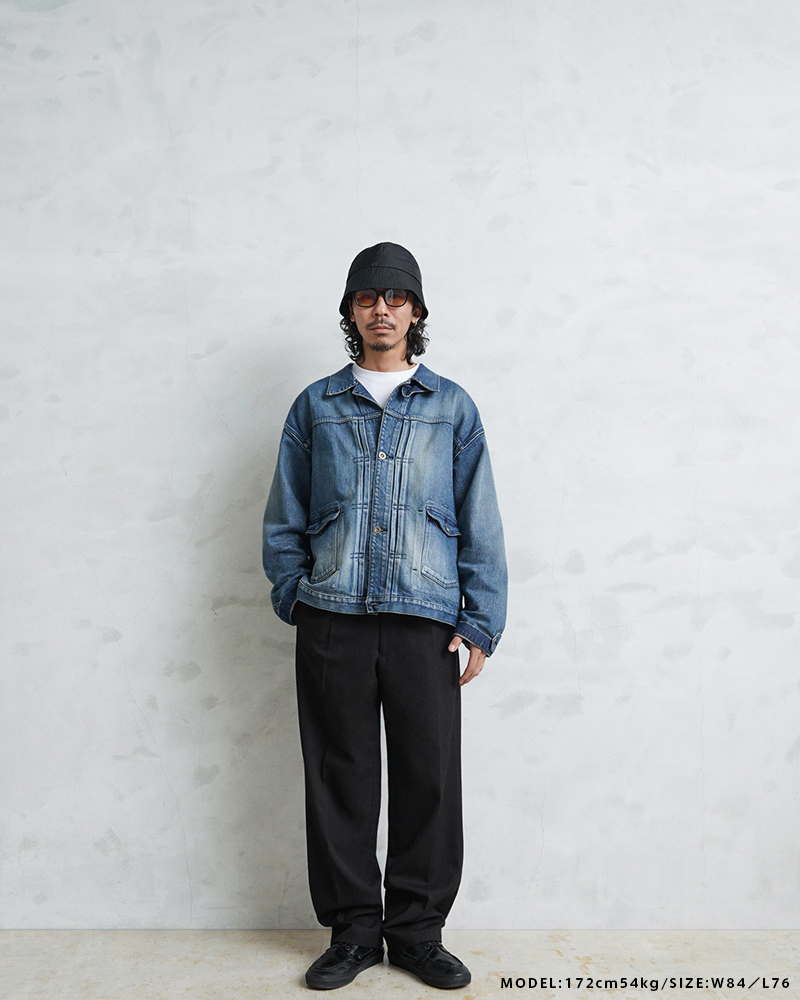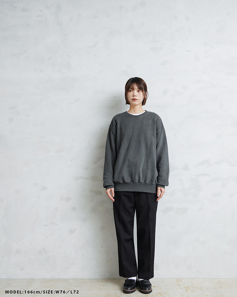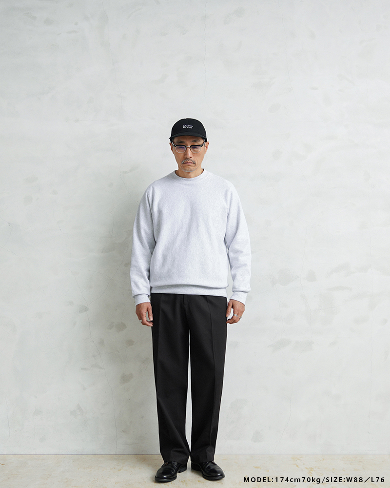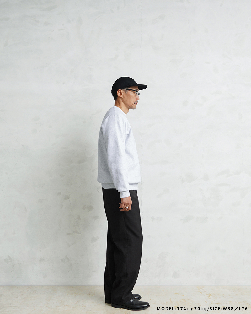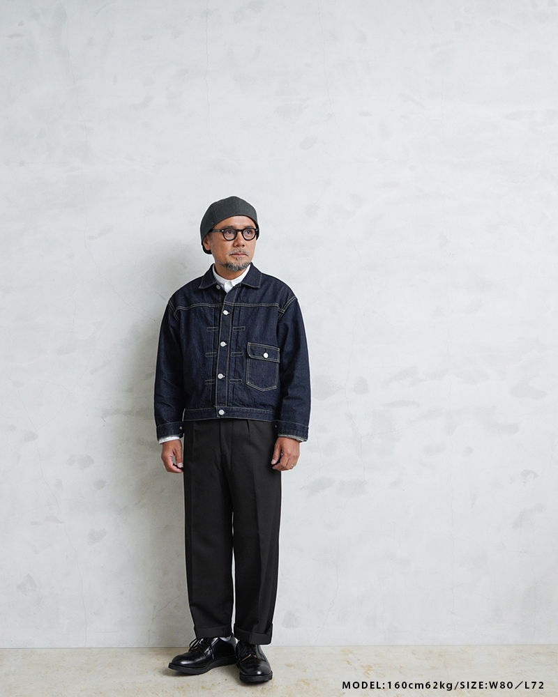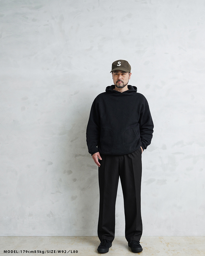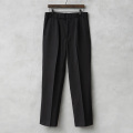 フロントは使いやすいジッパーフライを採用。サラッと肌触りの良いウール×ポリエステル混紡の生地を使用しています。太すぎず細すぎずの絶妙なシルエットと落ち着いたカラーリングでイギリスらしい雰囲気の1本です。 ウエストは2箇所のホックが付属していて、サイドのスラッシュポケットと、右側のみに付いたバックポケットは中身が落ちないようにボタン留めできる両玉縁ポケットがデザインされています。