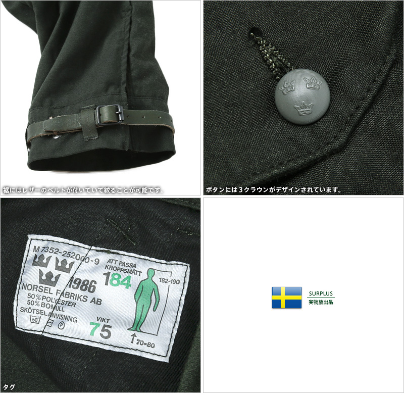 | 商品説明 | 実物 新品 スウェーデン軍 M-59 カーゴパンツ BLACK染め のご紹介です。 スウェーデン軍実物放出品です。 デッドストックでの放出は近年では珍しく、非常に希少性の高いM-59カーゴパンツが入荷しました! 欠損が多い裾のベルトも付属します。 元々グリーンだったものを染め職人に丁寧にBLACK染めしていただきました。 しかもこのM-59をBLACKに染めるのには、ポリエステルが混ざっているので非常に染めるのに苦労しています。 まず未使用なので洗いをかけ、その後一度ブリーチ加工し、そこからBLACK染めしています。 それでも完全なBLACKにはならず、少しグリーンが残った絶妙なBLACK染めに仕上がりました。 ウエスト周りはゆったりで、裾にかけてテーパードしたトレンド感のある綺麗なシルエット。 ベルトで裾幅が調整可能で、ブーツ、スニーカー、ローファーなど幅広くこなしてくれます。 フラップ付きのサイドポケットに、同じくフラップ付きのバックポケットとカーゴポケットも配置された収納力のあるデザイン。 両ひざには当て布を施し耐久性を高めるとともに、マチを設けることで動きやすさも確保しています。 M-90パーカーをはじめ、昨今非常に人気の高まっているスウェーデン軍放出アイテム。 特にこちらの1本は探されている方も多いのではないでしょうか。 厚手で丈夫なコットン/ポリエステル生地を使用し長く愛用していただけるアイテムです。 |