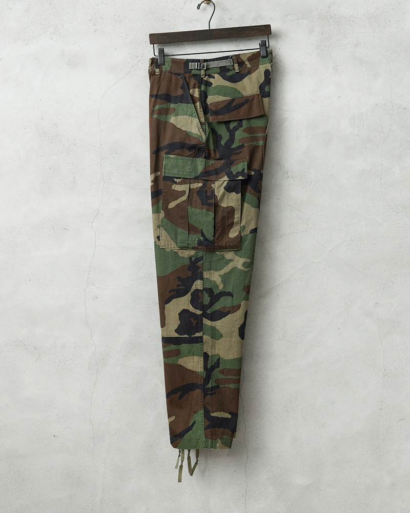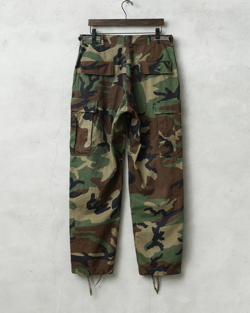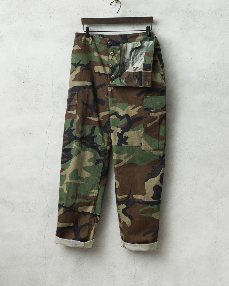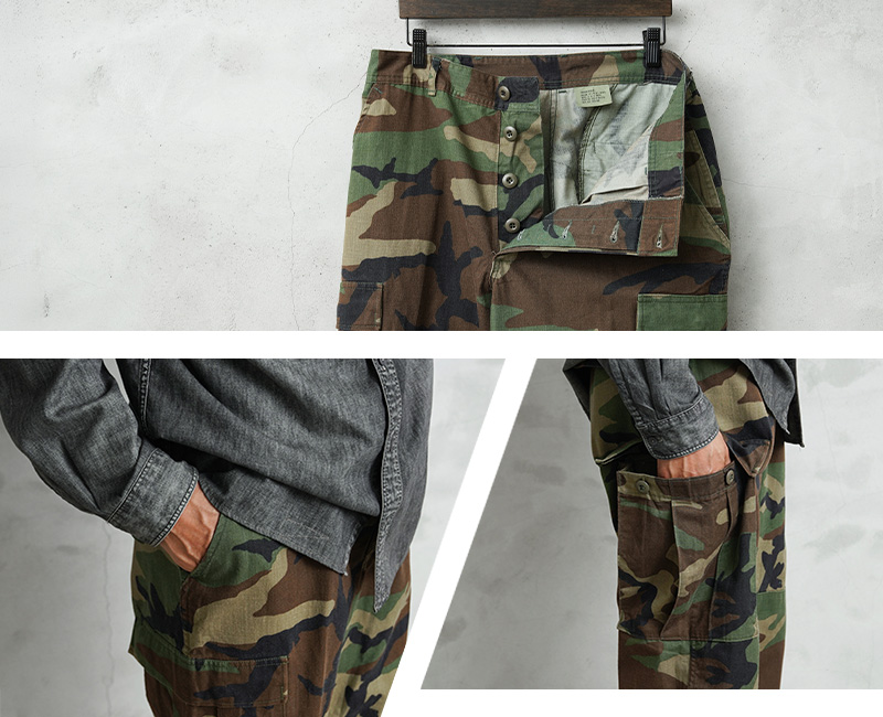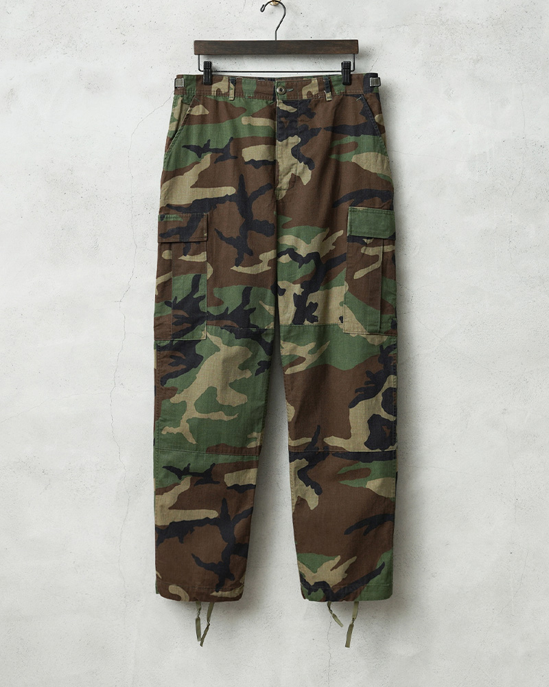 1981年より約30年以上にわたり全米軍(US ARMY,USAF,US NAVY,USMC)で使用されていたウッドランドカモ柄のBDUカーゴパンツです。BATTLE DRESS UNIFORM(バトル ドレス ユニフォーム)は、BDUという略称で呼ばれる戦闘服のことであり、米軍によって開発された戦闘服です。様々なブランドのカーゴパンツも基本は、このBDUパンツからインスピレーションを受けていると言ってもいいのではないでしょうか。こちらはノンリップNYCO(コットン50%、ナイロン50%)でリップストップ生地のBDUパンツと比較すると表面が格子織りになっていないしっかりとしたツイル生地を使用したBDUパンツになります。フロントはボタンフライ仕様で、ウエスト両サイドのアジャスターで細かい調整が可能です。BDUパンツの特徴とも言える膝部分の2重に補強されたダブルニーと、2重に補強されたヒップ部分が特徴的なデザインで、サイドポケット、バックポケット、カーゴポケットがそれぞれ2つずつ配置された6ポケットデザイン。