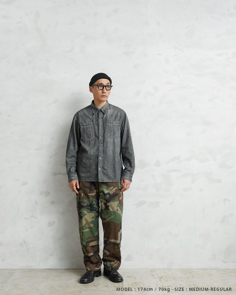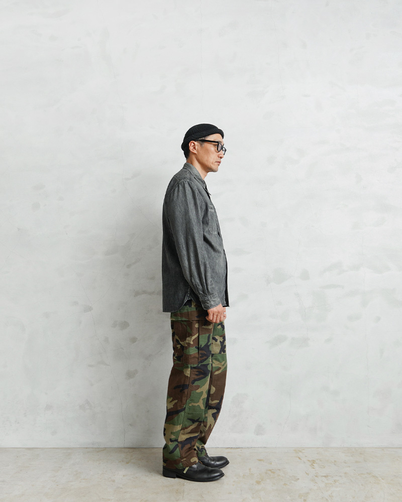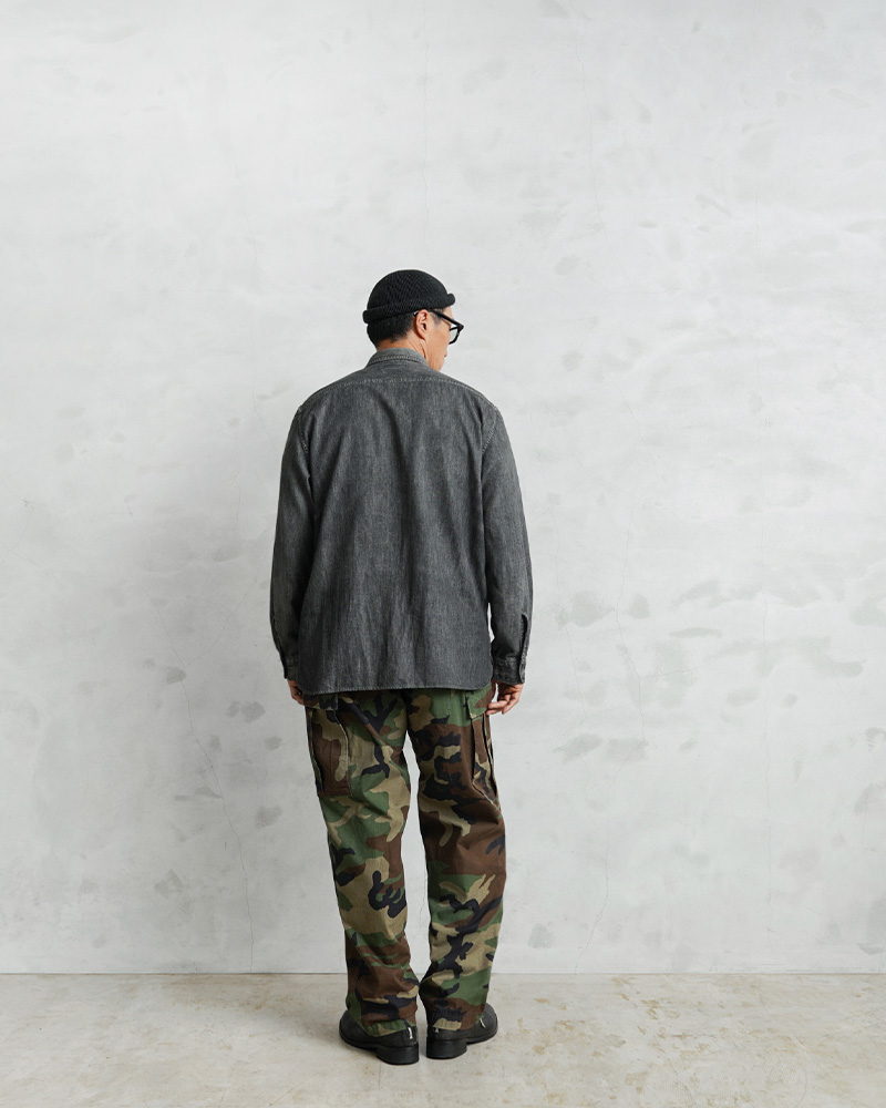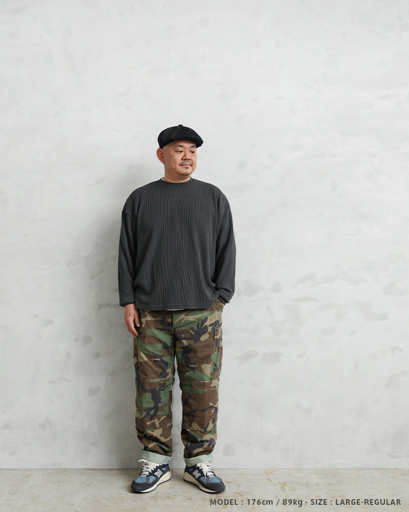 1981年より約30年以上にわたり全米軍(US ARMY,USAF,US NAVY,USMC)で使用されていたウッドランドカモ柄のBDUカーゴパンツです。BATTLE DRESS UNIFORM(バトル ドレス ユニフォーム)は、BDUという略称で呼ばれる戦闘服のことであり、米軍によって開発された戦闘服です。様々なブランドのカーゴパンツも基本は、このBDUパンツからインスピレーションを受けていると言ってもいいのではないでしょうか。こちらはノンリップNYCO(コットン50%、ナイロン50%)でリップストップ生地のBDUパンツと比較すると表面が格子織りになっていないしっかりとしたツイル生地を使用したBDUパンツになります。フロントはボタンフライ仕様で、ウエスト両サイドのアジャスターで細かい調整が可能です。BDUパンツの特徴とも言える膝部分の2重に補強されたダブルニーと、2重に補強されたヒップ部分が特徴的なデザインで、サイドポケット、バックポケット、カーゴポケットがそれぞれ2つずつ配置された6ポケットデザイン。
