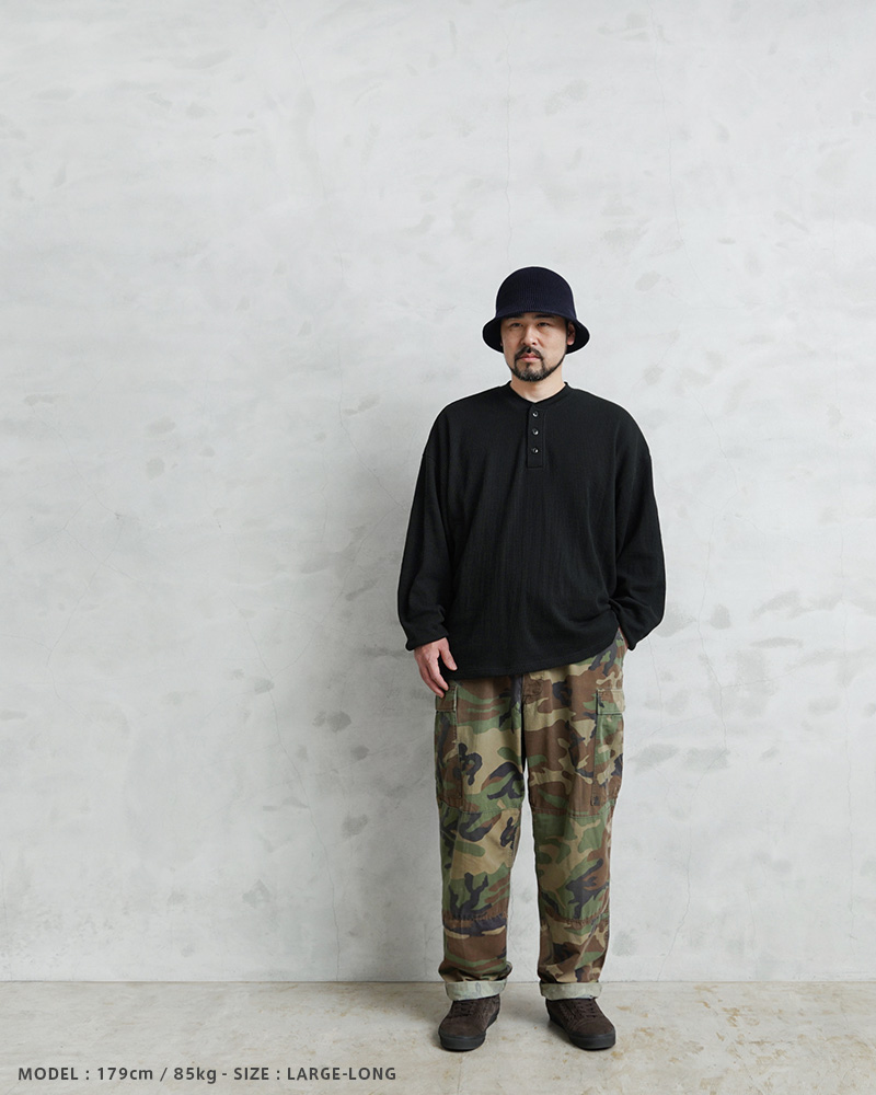 | 商品説明 | 実物 USED 米軍 BDU WOODLAND CAMO カーゴパンツ ノンリップのご紹介です。 制式名称:TROUSERS,WOODLAND CAMOUFLAGE,PATTERN;COMBAT 1981年より約30年以上にわたり全米軍(US ARMY,USAF,US NAVY,USMC)で使用されていたウッドランドカモ柄のBDUカーゴパンツです。 BATTLE DRESS UNIFORM(バトル ドレス ユニフォーム)は、BDUという略称で呼ばれる戦闘服のことであり、米軍によって開発された戦闘服です。様々なブランドのカーゴパンツも基本は、このBDUパンツからインスピレーションを受けていると言ってもいいのではないでしょうか。 こちらはノンリップNYCO(コットン50%、ナイロン50%)でリップストップ生地のBDUパンツと比較すると表面が格子織りになっていないしっかりとしたツイル生地を使用したBDUパンツになります。 フロントはボタンフライ仕様で、ウエスト両サイドのアジャスターで細かい調整が可能です。BDUパンツの特徴とも言える膝部分の2重に補強されたダブルニーと、2重に補強されたヒップ部分が特徴的なデザインで、サイドポケット、バックポケット、カーゴポケットがそれぞれ2つずつ配置された6ポケットデザイン。 バックポケットとカーゴポケットには2重構造のフラップが付いており、ボタンが外に露出しない仕様で、カーゴポケットにはマチ付きで立体的な構造になっています。裾はドローコードで調節が可能です。 アメリカ軍を代表する名作のBDUカーゴパンツと、世界で1番有名な迷彩であるウッドランドカモはまさにミリタリーの王道であり、本物でしか味わえない風合いが大きな魅力でラフに穿いていただきたい完成された1本です。 |