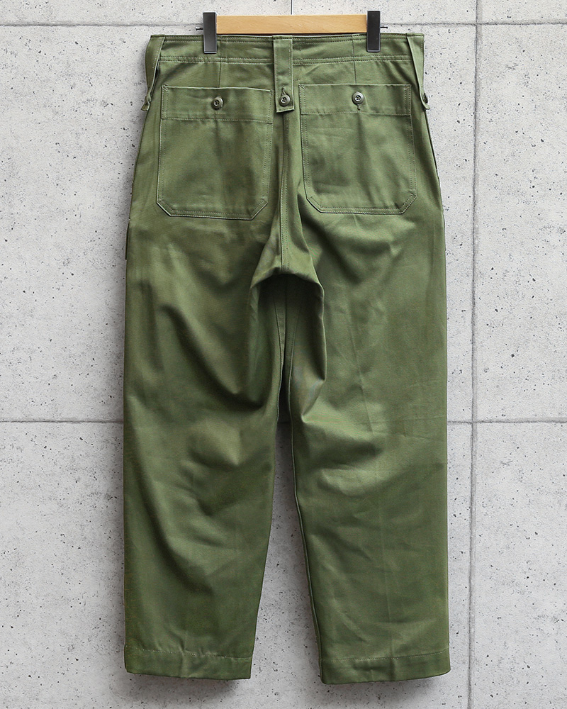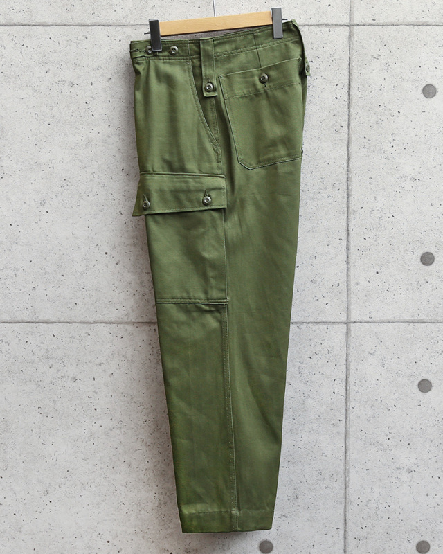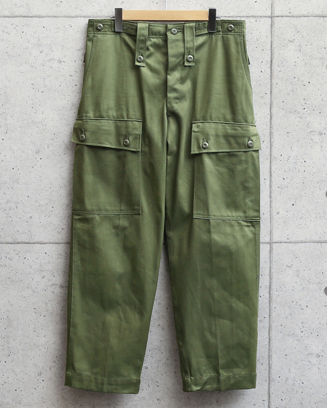 | 商品説明 | 実物 新品 デッドストック オーストラリア軍 ARMY ファティーグ カーゴパンツ のご紹介です。 非常に珍しい希少なオーストラリア軍実用のコンバットパンツが入荷しました! イギリス軍のファティーグパンツにも似た太めのウエストのベルトループ・サイドウエストのアジャスターデザインに、US物と同じベイカーボタン、比翼ではなく斜めにカットされたフラップが付くブッシュパンツ風にフロントに付けられたカーゴポケットのレイアウトで、他国の優れたデザインの中にオーストラリア軍の独創性も含まれたディテールのカーゴパンツです。 太すぎないバランスの良い綺麗なシルエットでフロントはボタンフライ、日本の気候ですとオールシーズン活躍できる素材感です。合わせやすい落ち着きのあるカラーでベーシックなアイテムではありますが、他とは違う独特なデザインは人と被らないレアなアイテムです。 特に今回入荷したような1980’sデッドストックは、これからもそう多く市場に出てこないと思われますので、この機会に是非どうぞ! |