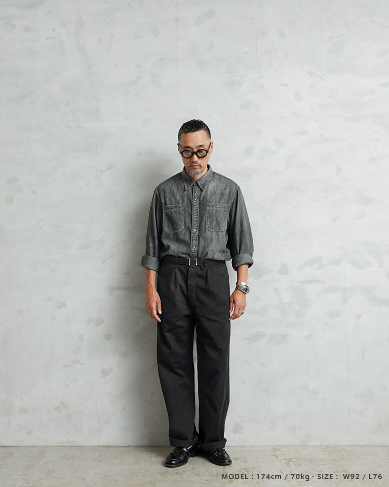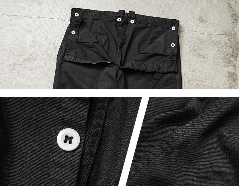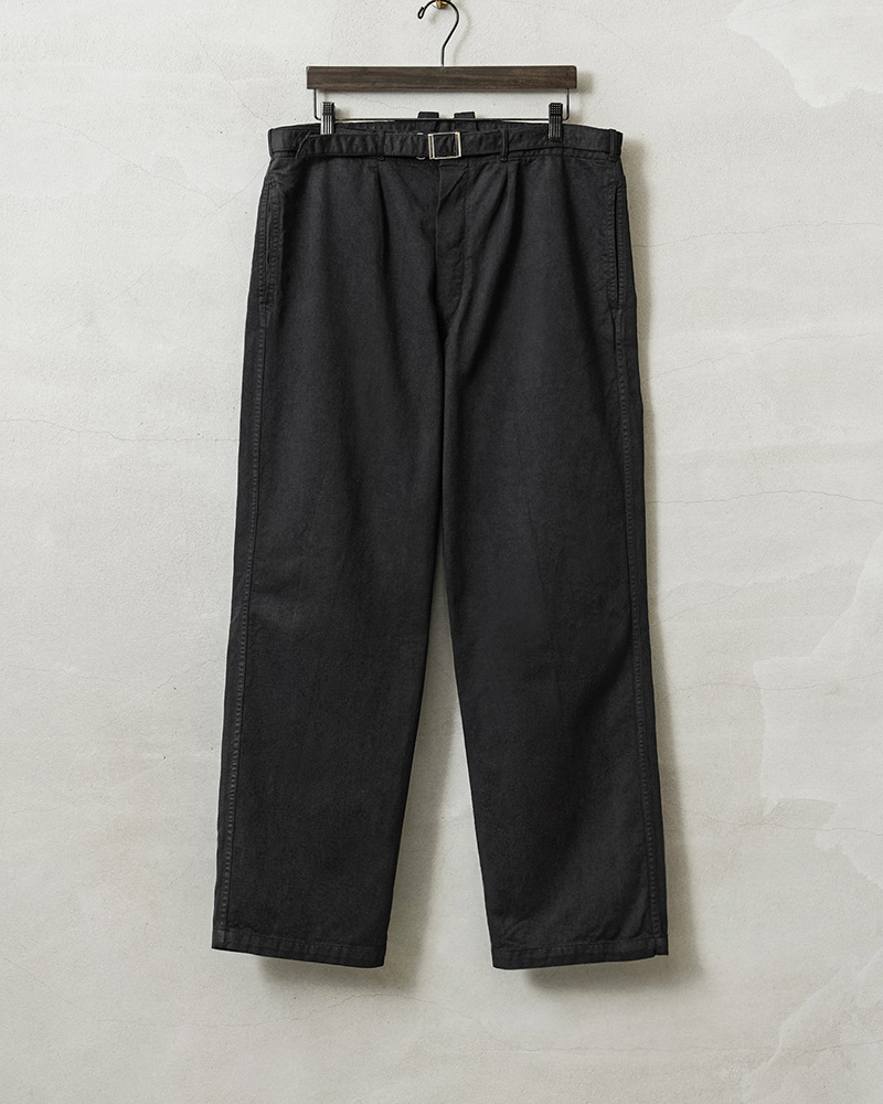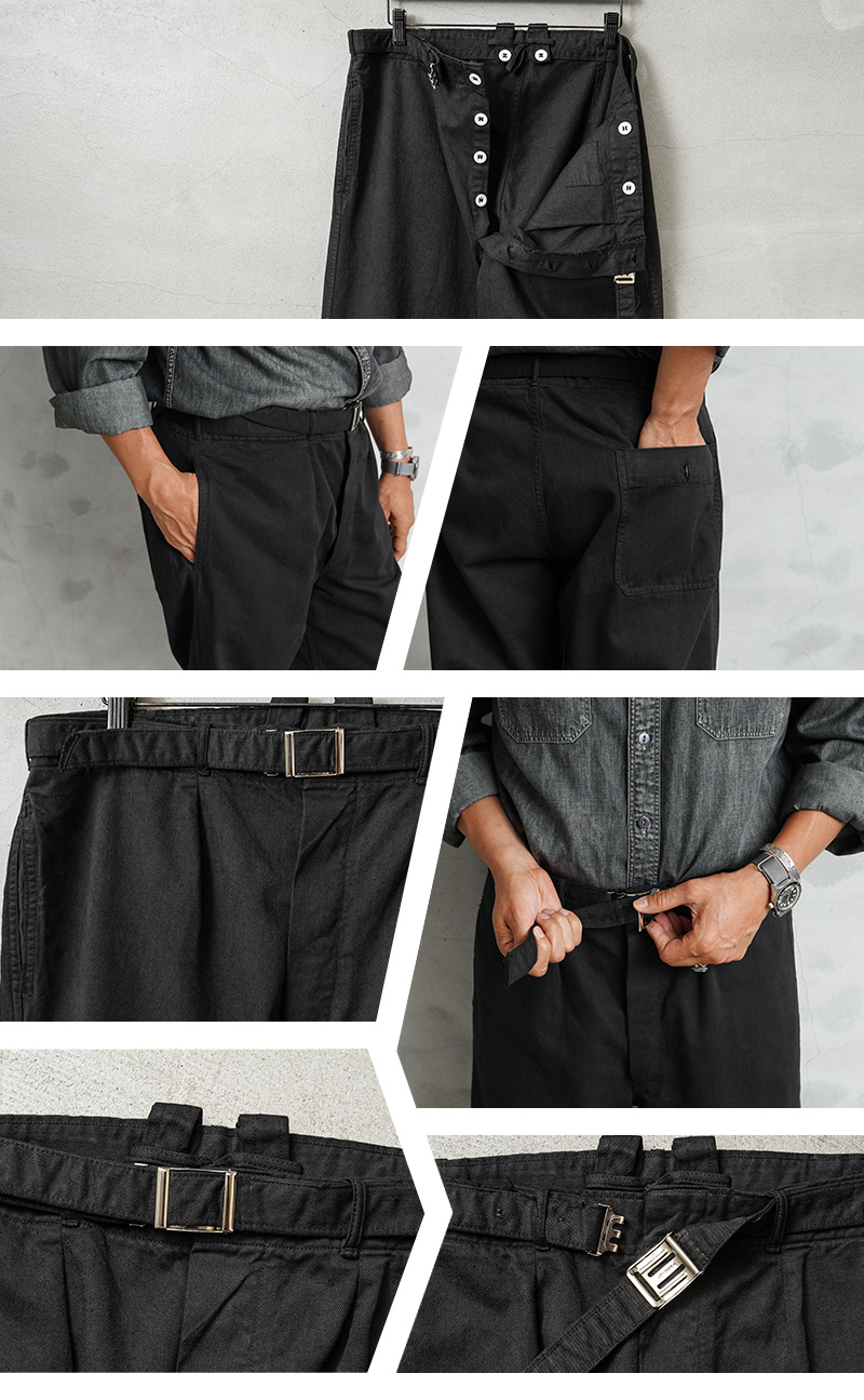 | 商品説明 | 実物 新品 デッドストック ドイツ軍 BW コットン ワークパンツ BLACK染めのご紹介です。 ドイツ軍実物放出のベルト付きのワークパンツです。 元々サックスブルーだった物を染め職人による丁寧なBLACK染めを施しました。張りと柔らかさもあるコットン生地が使用されていて、フロントボタンフライで、内側にサスペンダーボタンも付属。 パンツと同素材のシンプルなデザインのウエストベルトはバックル部分で調節可能で、トップスをインしてもバックルが良いアクセントになります!ベルトを取り外し、3.5cm以下のベルトを取り付けも可能です。 フロントはワンタック、サイドにはスラッシュポケット、右側にはバックポケットが付属しています。 特徴的なワイドシルエットは裾にかけてのカットが秀逸で、バランスが非常によく、ゆったりとしたサイジングでの着用もおすすめです。使いやすいパンツで、非常におすすめです! |