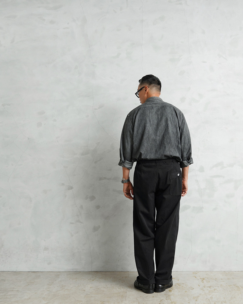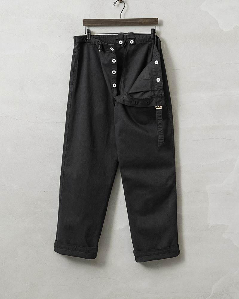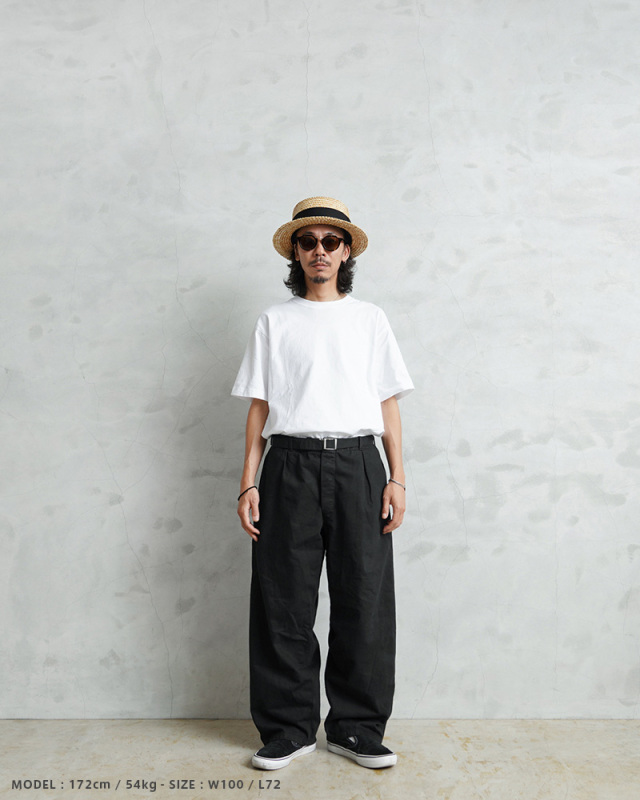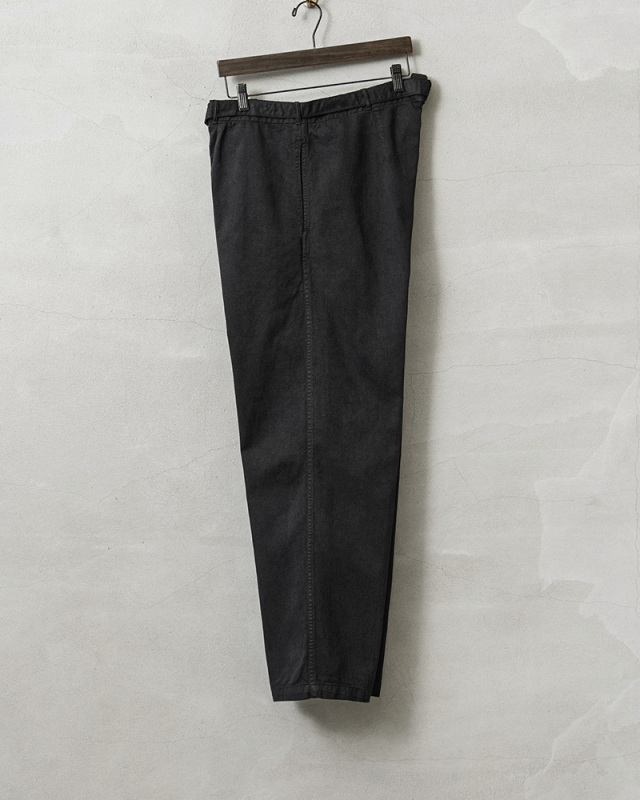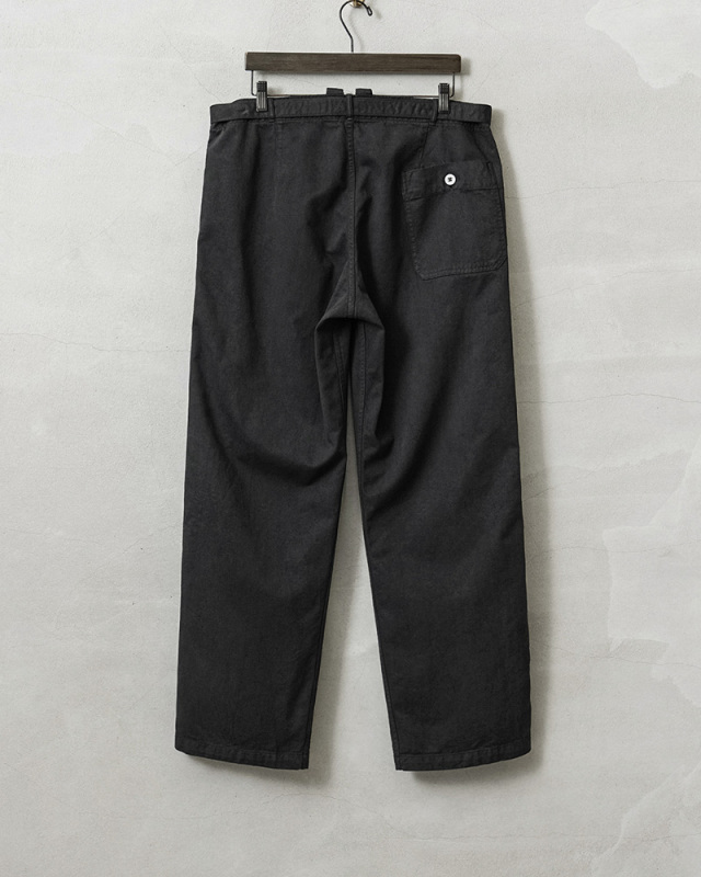 | 商品説明 | 実物 新品 デッドストック ドイツ軍 BW コットン ワークパンツ BLACK染めのご紹介です。 ドイツ軍実物放出のベルト付きのワークパンツです。 元々サックスブルーだった物を染め職人による丁寧なBLACK染めを施しました。張りと柔らかさもあるコットン生地が使用されていて、フロントボタンフライで、内側にサスペンダーボタンも付属。 パンツと同素材のシンプルなデザインのウエストベルトはバックル部分で調節可能で、トップスをインしてもバックルが良いアクセントになります!ベルトを取り外し、3.5cm以下のベルトを取り付けも可能です。 フロントはワンタック、サイドにはスラッシュポケット、右側にはバックポケットが付属しています。 特徴的なワイドシルエットは裾にかけてのカットが秀逸で、バランスが非常によく、ゆったりとしたサイジングでの着用もおすすめです。使いやすいパンツで、非常におすすめです! |