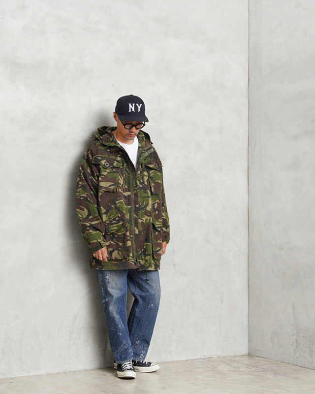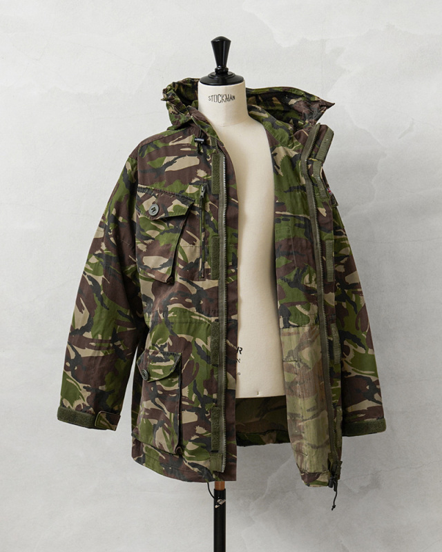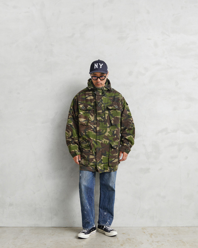 | 商品説明 | 実物 USED イギリス軍 WINDPROOF コンバット スモック DPMカモのご紹介です。 制式名称:Smock,Combat,Windproof Woodland DP イギリス軍より実物放出のウィンドプルーフ コンバットスモックは、英国海兵隊やSASなどを始め広く使用されている防風、防寒性に優れている機能的なジャケットです。 CS95(Combat Soldier 95)システムの一つとして採用されたジャケットで、DPMカモ(Disruptive Pattern Material)を使用しています。DPMカモは1960年代にイギリス軍全体へ向けて採用されました。2010年にMTP(Multi Terrain Pattern)が導入されるまで使用されていた長い歴史を誇った迷彩柄です。 ベルクロとダブルジッパーで開閉するデザインで、フロントにはマチ付きのボタン開閉のフラップポケットと、縦方向に取り付けられた胸のジッパーポケットの内側にはそれぞれペンホルダーが付属、さらに腰から上の前身頃が大型のポケットとして使用できる大容量ポケットになっています。左袖には小型のユーティリティポケットが備わっている、優れた収納力を持ち合わせたデザインです。 フード先端にはワイヤーが内蔵されていますのでお好きな形状に形を整えてキープすることもできます。フード、ウエストにはドローコード付きでフィット感を調節できる仕様で、袖口もベルクロで調節できます。ボタンにはスロットボタン(パラシュートボタン)が採用されています。 コットン、ポリエステルの混紡素材は、タフで長く使える素材感。他国にはないイギリス軍の独創的なデザインのコンバットスモックは、タウンユースのみならずアウトドアシーンにも活躍する高機能ジャケットです! |