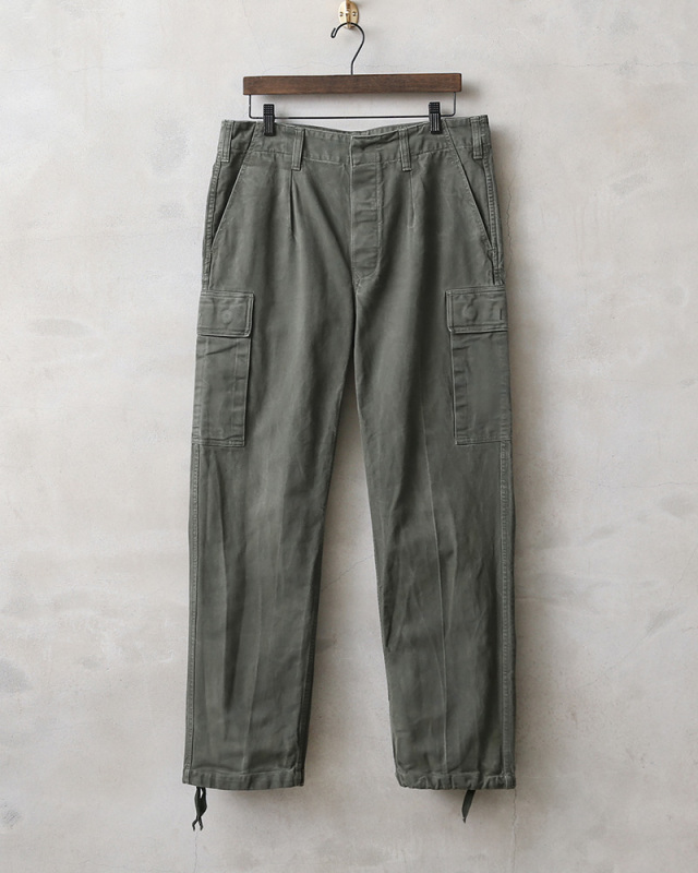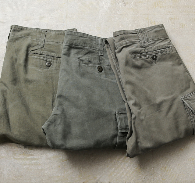 | 商品説明 | 希少 実物 USED ドイツ軍 モールスキン カーゴパンツのご紹介です。 ミリタリーパンツの中でも名作のひとつ、ドイツ軍のモールスキンカーゴパンツです。 最近は数の激減もあり見つかりにくくなってきたアイテムで、当店でも久しぶりに入荷しました!軍パン特有の野暮ったさはなく、きれいなシルエットが魅力で、テーパードが効いたシルエットは普段着のコーディネートに取り入れやすい洗練されたシンプルなデザインです。 ヴィンテージのフレンチワークアイテムなどによく使われているモールスキン素材ですが、モールスキンは、太い綿糸を生地の片面だけではなく、両面に起毛させながら織り上げています。mole(モグラ)skin(肌)という意味でもともとはモグラの毛皮を指していました。 丈夫な綿素材と言えば、キャンバスやデニムがよく使用されていますが、実は最も丈夫なのが、このモールスキンと言われています。織りの密度が高く、耐久性にすぐれたやや厚手のコットン生地は使い込むほどに風合いが増し、USEDでも長く着用していただける堅牢性の高い素材です。 こちらはミリタリートラウザーの中でもとりわけ希少な存在とされているカーゴパンツで、フロントはボタンフライ、バックポケットは1つ、サイドカーゴポケットはボタンタイプ、裾にはドローコードが入っています。 股下にはベンチレーションの役割を果たすホールも備わっています。ミリタリーならではのディテールでありながらもモールスキン素材が他とは違う独特な存在感を放ち、スマートに着用していただける多くのブランドからもサンプリングされてきたパンツです。 着込まれることでのみ現れるアタリや経年変化の表情が素晴らしく、ネクストヴィンテージと呼んでも差し支えない非常に希少なカーゴパンツで、今や完全に市場から姿を消しつつある希少なアイテムです。 |