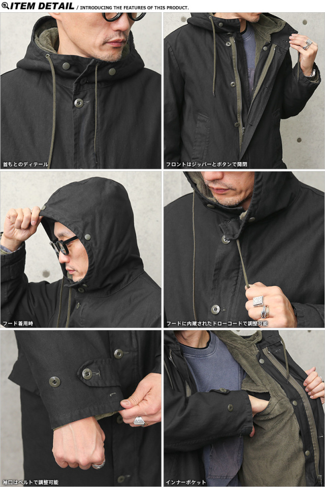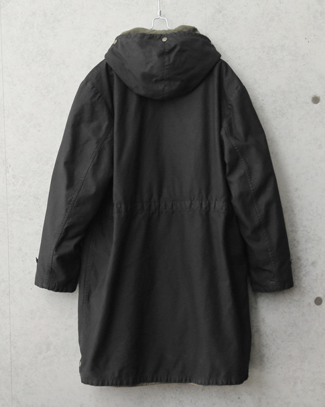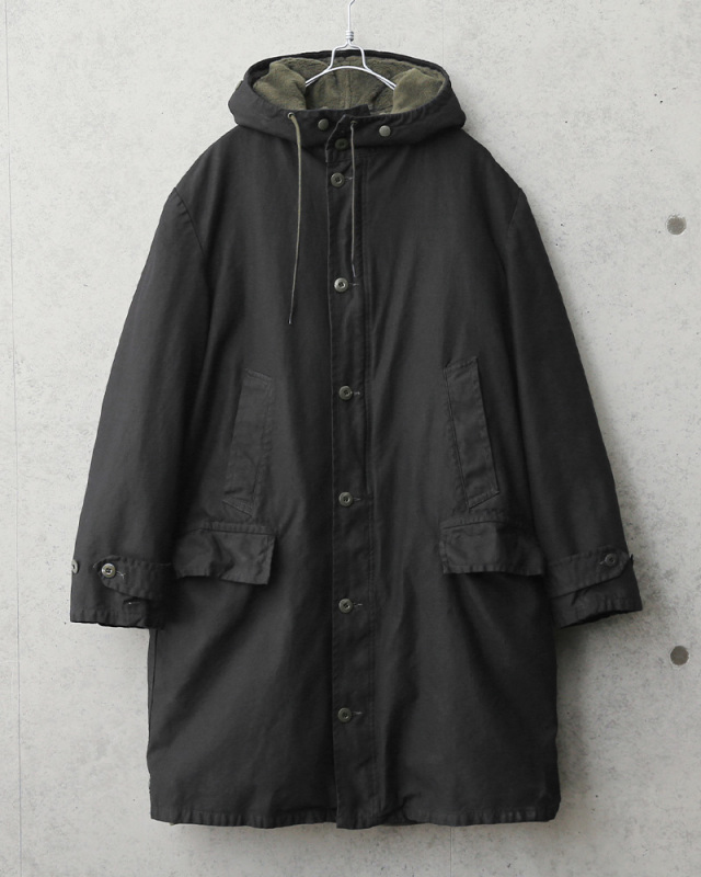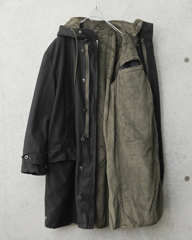 元々ODだったロングフィールドパーカーを、染め職人に丁寧にBLACK染めしていただきました。 ドイツ軍で採用されていた厚手のパーカーで、ボア状のライナーが着脱可能。防寒性もあり、スタイリッシュなデザインはファッションジャンルを問わず着ていただけます。 ライナーを外せば薄手のコートになりますので春、秋、冬と3シーズンで大活躍致します。またライナー単体で着る際にもデザイン性が高いことから、アウターとしての着用もおすすめです! ディティール ・フード一体型のデザイン ・フロントはジッパーとボタンで開閉 ・ポケットは腰上部×2、腰下部×2、内ポケット×1 ・フード及び裾には絞れる様にコードが内蔵されています ・ライナーはボタンで脱着可能 |