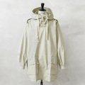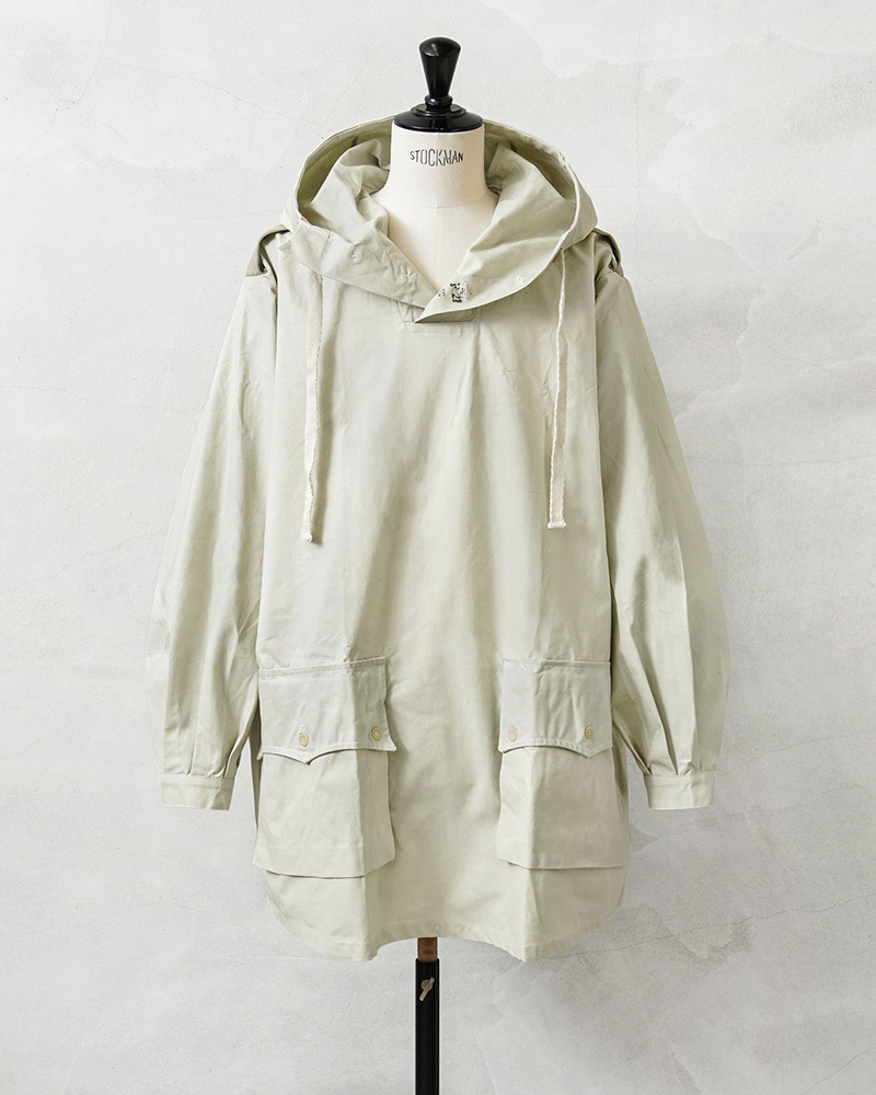 1940年代にスウェーデン軍で採用された、雪上戦闘用のスノーカモパーカー。後継モデルであるM-62とは異なり、こちらはクラシカルなプルオーバータイプで見るからに年代物の希少な雰囲気を醸し出しています。スノーカモパーカーと言えばホワイトカラーを連想しますが、個体差がありつつもこちらはオフホワイトといった色味でタウンユースにも使いやすい色合いとなっています。本来は冬季装備の上から着用する作りのため、全体的にゆとりのある設計。広めのアームホール、存在感のある大ぶりなフード、フロントの大型フラップポケット、そしてあえて露出した剥き出しのボタンもデザインのアクセントに。首元は2ボタン仕様、フードはドローコードで調整可能です。