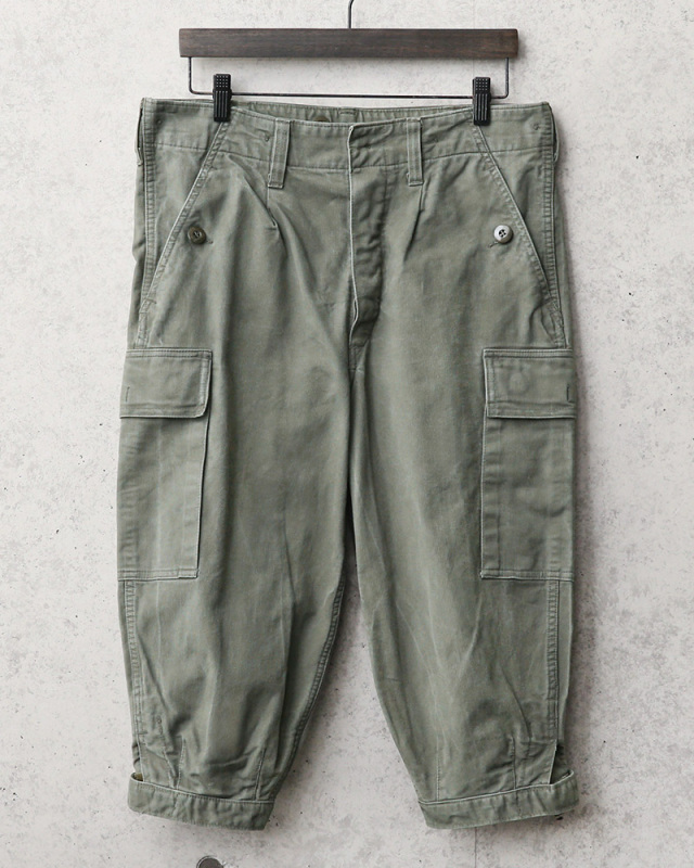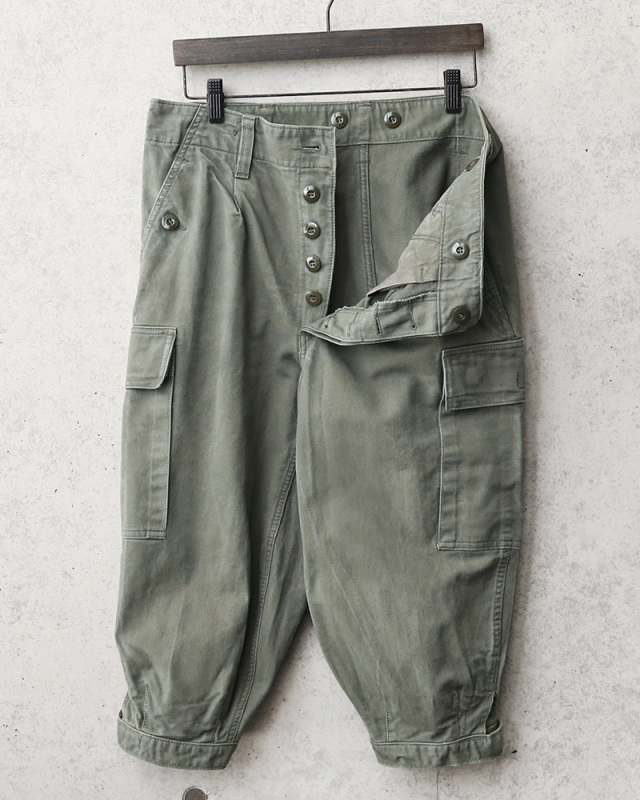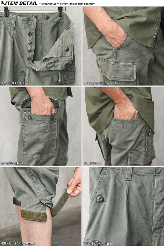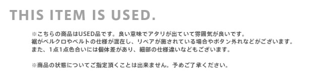 | 商品状態 | 軍放出のUSED ※こちらの商品はUSED品です。良い意味でアタリが出ていて雰囲気が良いです。裾がベルクロやベルトの仕様が混在し、リペアが施されている場合やボタン外れなどがございます。また、1点1点色合いには個体差があり、細部の仕様違いなどもございます。商品の状態に関してはお選び頂けませんので予めご了承下さい。 |