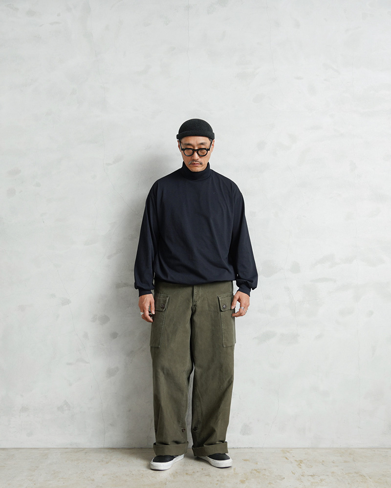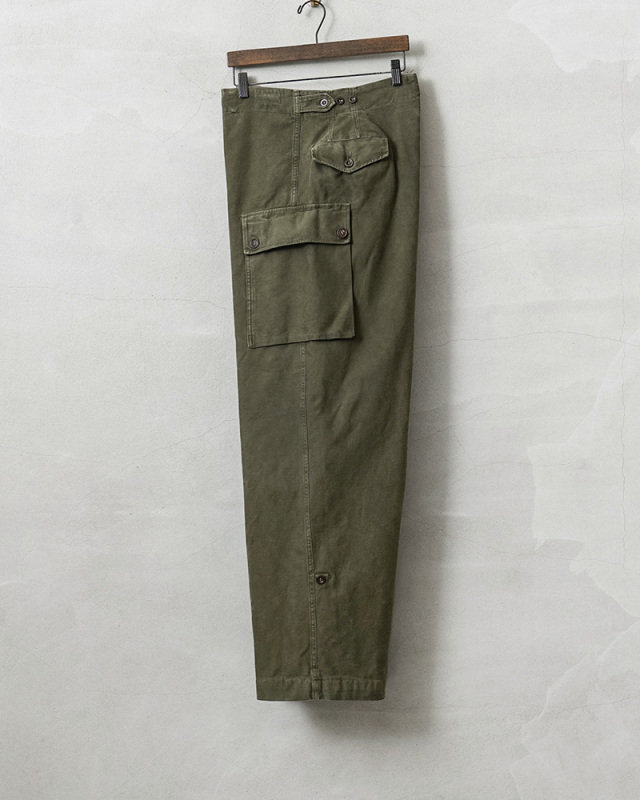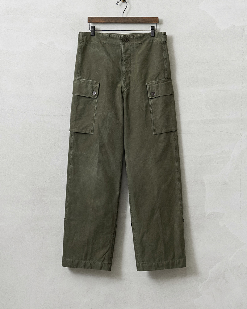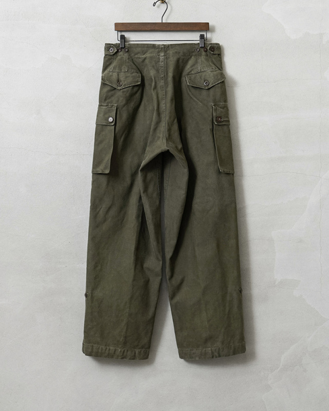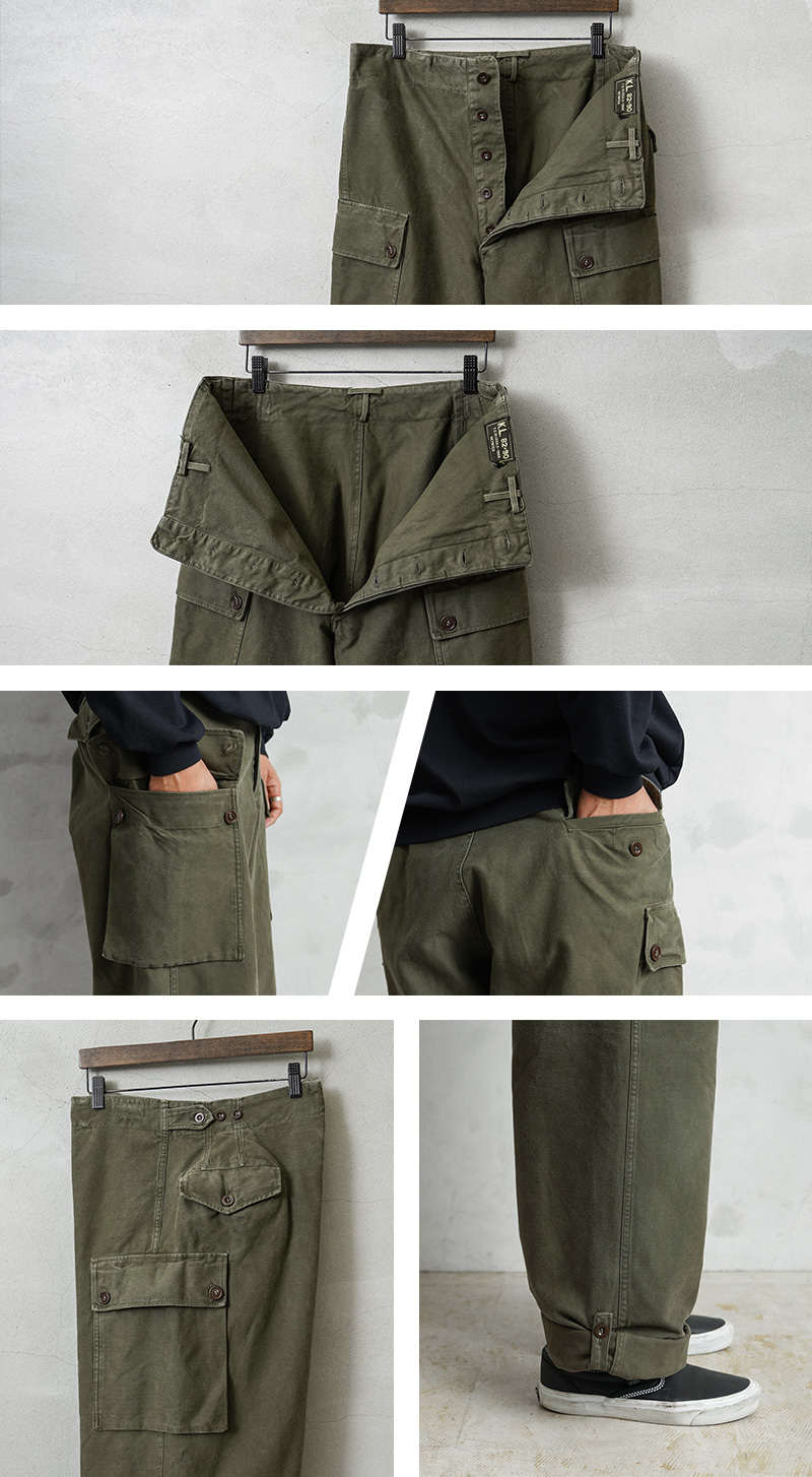 厚手のコットン生地を2枚張り合わせたダブルフェイス仕様で、かなり丈夫なオランダ軍放出のフィールドパンツ。味のあるコットンバックサテンの生地感が魅力の1本です。フラップ付きのバックポケットと両サイドにはかなり大きめのカーゴポケットを配置し収納力のあるデザイン。ウエストは両サイドのアジャスターで調整可能です。人気のフランス軍M-47や米軍M-65を彷彿とさせるワイドシルエット。裾はロールアップしてストラップで留めることができ、クロップドスタイルも楽しめるアイテムです。