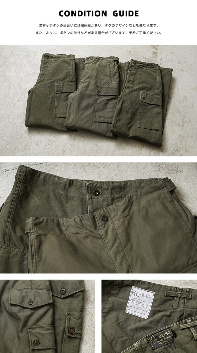 ※こちらの商品はUSED品です。良い意味でアタリが出ていて雰囲気が良いです。色合いやタグのデザインなどには個体差がございます。素材やボタンの色合いには個体差があり、タグのデザインなども異なります。また、ホツレ、ボタンの欠けなどがある場合がございます。また、汚れやマーキング等がある場合や軍放出品のためディテールが若干異なる場合がございます。それぞれから味のある1点物のヴィンテージらしい魅力を感じていただけるアイテムです。商品の状態についてご指定いただくことは出来ませんので予めご了承ください。