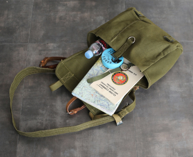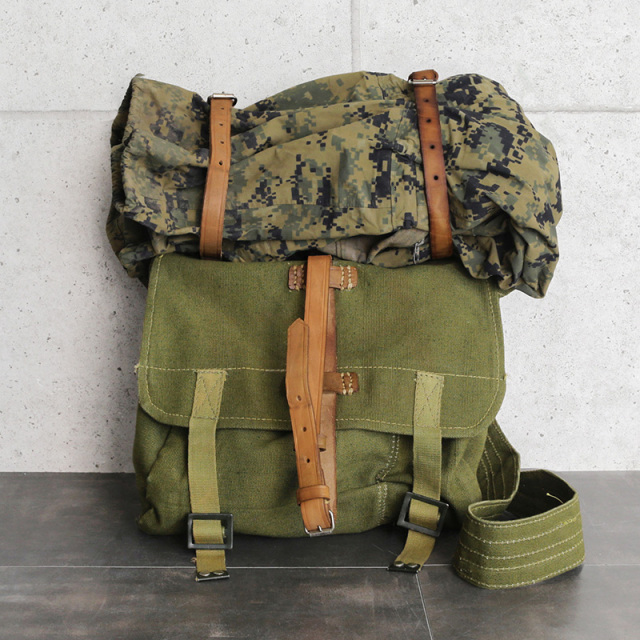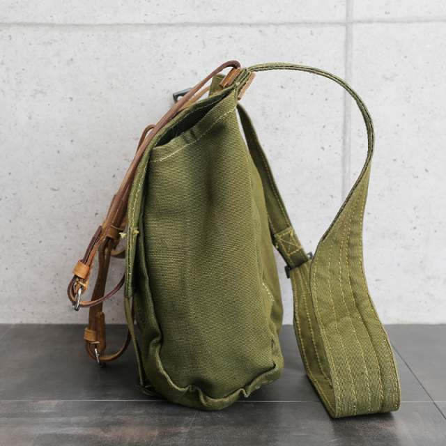 ルーマニア軍より放出された実物のブレッドバッグが入荷しました。 軽食や身の回り品を持ち運ぶショルダーバッグの通称として親しまれているブレッドバッグですが、ヴィンテージ感あふれる素材が魅力的。頑丈で肌触りが特徴的なコットンキャンバスとレザーが使用されたしっかりとした作りです。 同素材のバックパックにも共通して言えますが、長年保管されていたヴィンテージアイテムの為、レザーや金属部分、縫製の質感まで今の時代の製品には出せない重厚感が魅力です。 こちらはレザー製のストラップが付属していますので、バッグに入らない大型の荷物が固定できるようになっています。 アウトドアや軽旅行にはもちろん、タウンユースなど様々な場面で活躍できる希少なヴィンテージショルダーです。 |