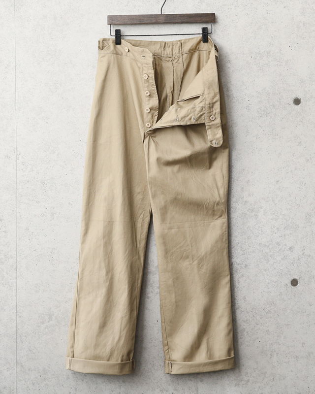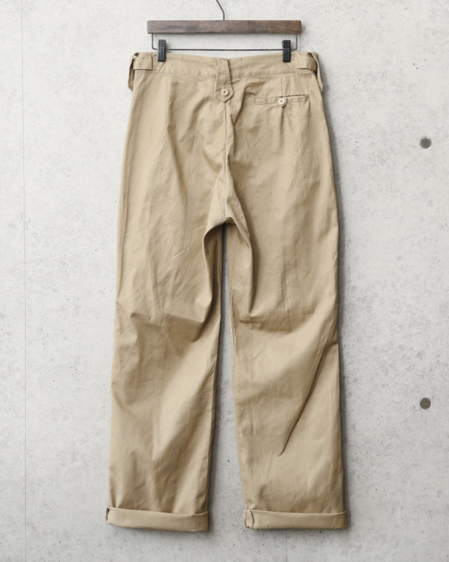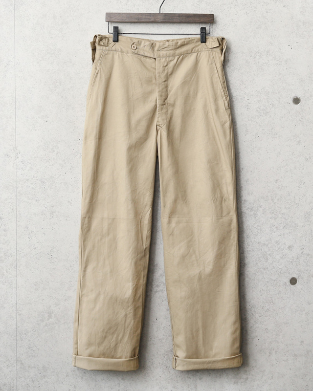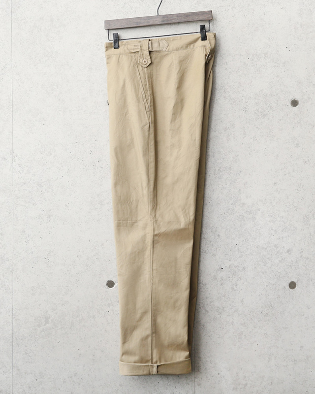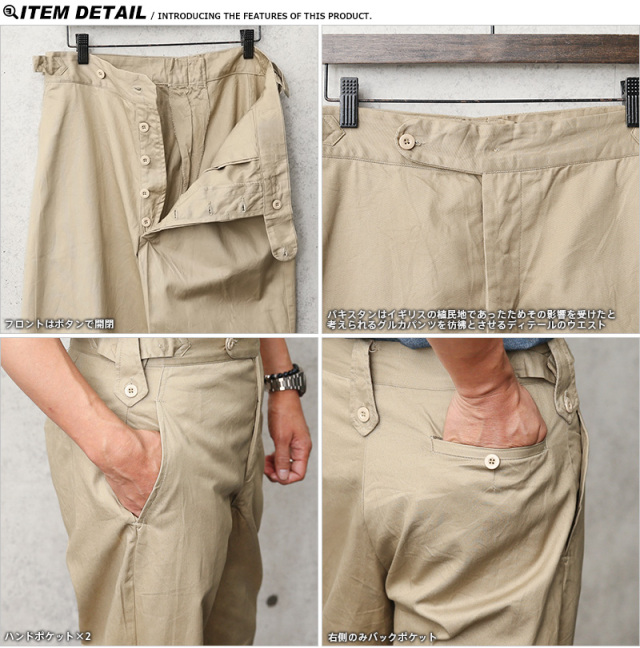 | 商品説明 | 実物 USED パキスタン軍 グルカパンツのご紹介です。 パキスタン軍から実物放出のグルカパンツが入荷しました。 パキスタンは元々、1858年にイギリスがインドに成立させた「イギリス領インド帝国」の一部で、1947年までは事実上イギリスの植民地だったためイギリス軍のファティーグパンツのような ウエスト周りのディテールなどの影響を受けていることが感じ取れるデザインになっています。 左綾のコットンチノクロス素材を使用しており、快適な着心地の質感でシンプルなストレートシルエット、裾は未処理ですのでお好みの長さにロールアップして着用していただくのがおすすめです。 サイドの金属製アジャスターで調節可能、ベルトループ部分が幅広なボタン式でデザイン性に優れており、フロントの長めの持ち出しやウエスト回りのデザインがカッコいいのでシャツや、Tシャツをインして着こなすのもいいですね! シーンに合わせてカジュアルにもフォーマルにも着こなせる、シンプルで洗練された一着です。 |