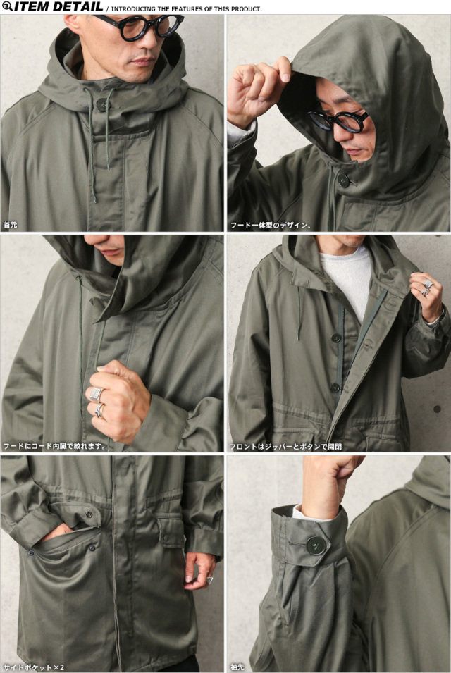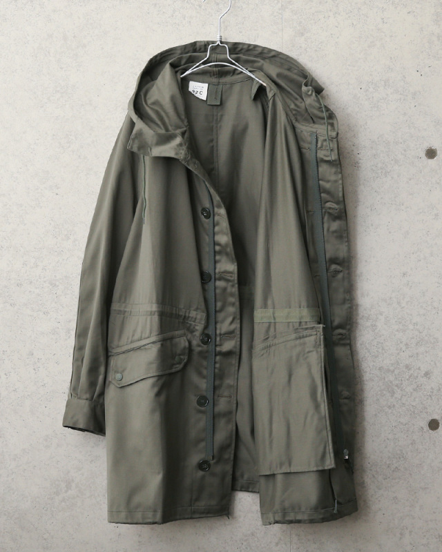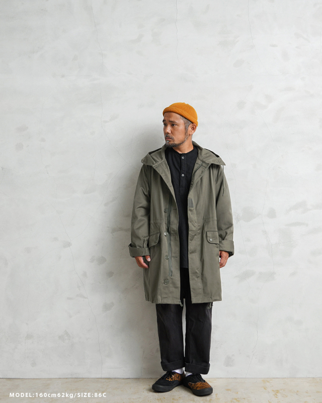 1964年に採用されたフランス軍 M-64 フィールドパーカーシェルです。 米軍で人気のM-51パーカーのフランス版と言った感じでフランス版モッズコートです。 本来脱着可能なボアライナーが付くのですが、今回の入荷はシェルのみデッドストックで発見しました。 コットン100%素材のシェルは長い間着込んだり洗濯を繰り返すことにより、いい感じの経年変化がお楽しみいただけ、非常に高い人気を誇るアイテムです。 素晴らしいデザインで素材が柔らかくとても着やすいコートです。 スーツの上から着ても雰囲気が良くカッコいいです。 ライナーは付いていないですが、インナーを自由に組み合わせることで春、秋、冬も着ていただけ3シーズン大活躍致します。 近年放出が減少していますのでもはやなくなるのも時間の問題です。 更にデッドストックとなると今の時期を逃すと次はないかもしれません。 本当にお勧めです。 |