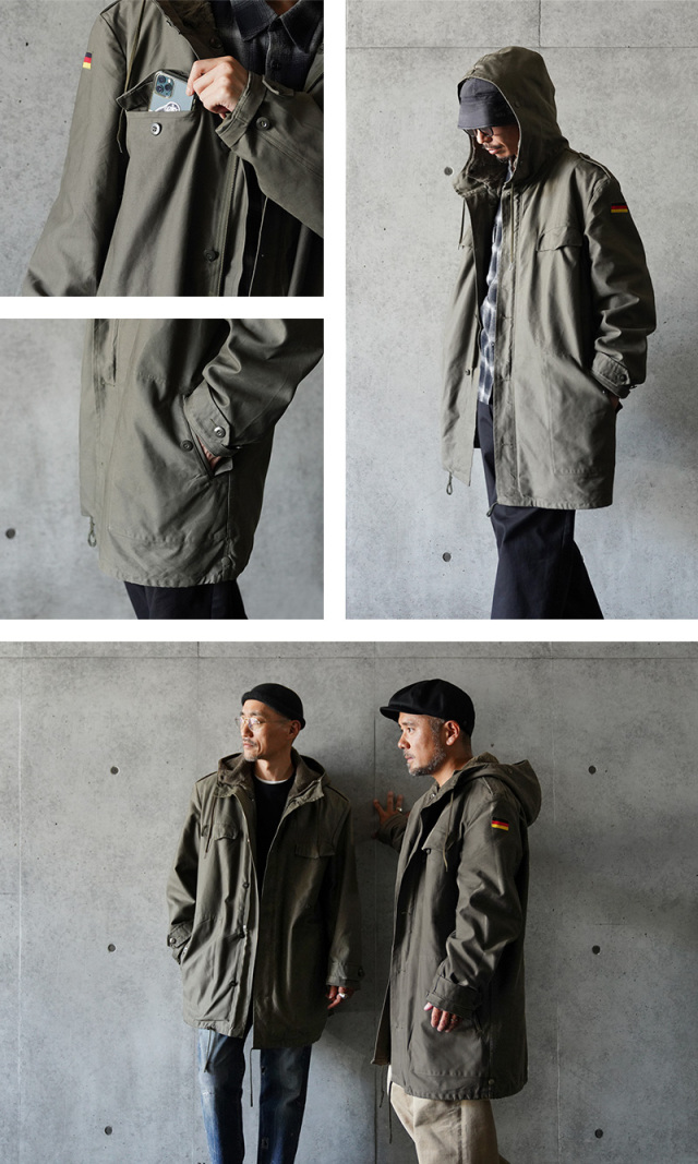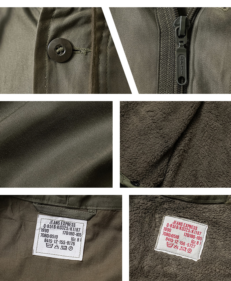 | 商品説明 | 実物 USED ドイツ軍 ボアライニング フィールドパーカー ODのご紹介です。 近年発見が非常に難しく入手困難な、ドイツ連邦軍において1960年代初頭から、90年代初頭まで採用されていたライナー着脱可能な厚手のフィールドパーカーです。 フレクターカモや、フレックターンと呼ばれるカモパターンのフィールドユニフォームが採用される90年代まで使用されていたアイテムで、USEDですが良い雰囲気が出ています。これが本物にしか出せない味だと思います。 ボアライナーが着脱可能な厚手のパーカーで、防寒性もあり、スタイリッシュなデザインでファッションのジャンルを問わず着ていただけます。 ライナーを外せば薄手のコートになりますので春、秋も着ていただけますので3シーズン大活躍します。 昨今はライナーのみの着用が当たり前になってきていますので、このボアライナーをライナーとして使用する場合はボアを内側にしてシェルに取り付けますが、ボアライナー単体で着用する際にはボア部分を外側にすることで、ライナーだけでの着こなしもできる面白いデザインをしているのでおすすめです! フロントはジッパーとボタンで開閉、フード一体型のデザインで、フード部分や袖の内側までボアが付きますので防寒性は抜群。フラップ付きの胸ポケットに、インナーポケットも1つ付属、ウエスト部分のポケットはフラップを内側に入れることで手の出し入れもしやすく使用可能です。フード及び裾にはコードが内蔵されています。 最近では放出される機会も本当に少なくなりました。米軍のM-65 フィッシュテールパーカー(モッズコート)に並ぶ人気を誇り、ライナー付きで実用性が高く、タウンユースにも馴染むデザインは希少性、ファッション性、実用性の三拍子が揃った名品で、ドイツ版のモッズコートと言ったフィールドパーカーです!本当に出てこない希少アイテムです。この機会にぜひ! |