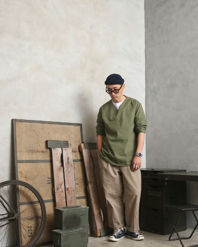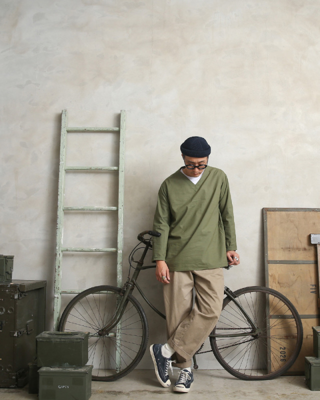 1980年代のロシア軍放出のスリーピングシャツです。 スリーピングシャツの中でもロシア軍のものは特に人気があり、こちらはあまり見かけないVネックのタイプで、しかも後染めではなくオリジナルカラーのOLIVEになります。 肌触りがよく着心地の軽いコットン生地を使用。リネンのような粗めの織りで非常に味のある生地感です。位置や濃淡など個体差がございますが、シンプルデザインに施されたサイズ表記のステンシルスタンプが雰囲気をグッと引き上げています。 キレイめからカジュアルまで、幅広いスタイルにマッチしてくれる一枚で、スラックスなどと合わせてモードな雰囲気も楽しめますし、夏には着崩してショーツなどと合わせてもオシャレです。ジャストサイズはもちろんオーバーサイズな着こなしもオススメ。 男女問わずお使いいただけるアイテムです。 |