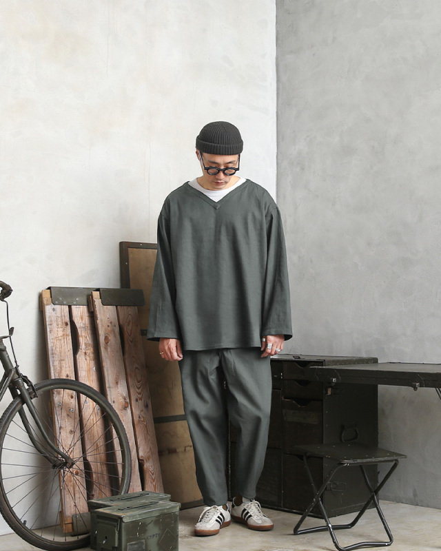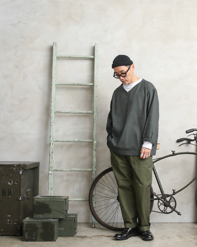 | 商品説明 | 実物 新品 デッドストック ロシア軍 70s Vネック スリーピングシャツ Olive Grayのご紹介です。 70年代に使用されていたロシア軍(旧ソビエト連邦)のスリーピングシャツで、希少で非常に珍しいオリジナルカラーの「Olive Gray」になります。 ホワイトのスリーピングシャツを後染めしたアイテムは、以前にもリリースしておりますがオリジナルでこの色が存在していたんです。グレーとオリーブをミックスしたような深く味わいのあるカラーで、Vネックのタイプになります。 程よく肉厚でハリのあるコットン100%生地は雰囲気抜群で、裏は微起毛しているので素肌で着た時の肌触りも良く、コットン100%でネップ感のある年代の古いコットンの生地感が魅力。着込むことで風合いの増す1着です。 キレイめからカジュアルまで、幅広いスタイルにマッチしてくれる1枚で、スラックスなどと合わせてモードな雰囲気も楽しめますし、夏には着崩してショーツなどと合わせてもオシャレです。ジャストサイズはもちろんオーバーサイズな着こなしもオススメ。 袖をロールアップするなど、程よく着くずすし抜け感を出すことで、肩の力を抜いた大人の着こなしが楽しめる、男女問わずお使いいただけるアイテムです。 |