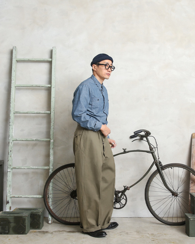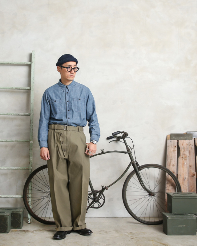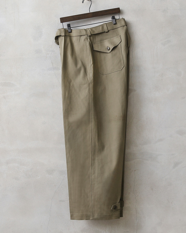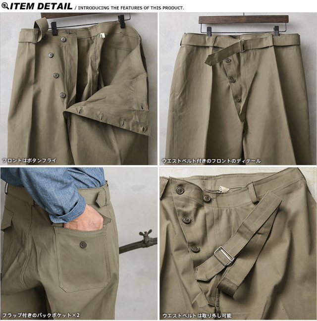 | 商品説明 | 実物 新品 デッドストック イタリア軍 モーターサイクルパンツのご紹介です。 イタリア軍から1950年代から70年代頃のゴム引きコットンを使用した防水性能を有したオーバーパンツが入荷! フロントの斜めにデザインされたボタンフライのディテールが目を引く独特なデザインのオーバーパンツで、本来パンツの上から着用するパンツのため、ゆとりのあるワイドシルエットで金属製バックルのウエストベルトが付属していますのでウエストを絞ってゆったりと着用していただけます。 ゴム引きコットンとは2枚の生地の間に溶かした天然ゴムを塗って圧着する防水生地のことで、表地、裏地はコットン素材ですので表面は濡れますが、雨が中に染み込んでこないという利点のある素材です。裏側の縫い目にはシームテープで防水処理が施されています。 フランス軍のバイク部隊で使用されていたモーターサイクルパンツとウエストベルトや裾のディテールなどの特徴が似ており、ヴィンテージ感漂う雰囲気で、フロントにポケットはありませんが、バックポケットの鋭角なデザインのフラップなども個性的です。 独特なハリのある素材感はパンツのシルエットが崩れにくくラインをより際立たせます。トレンド感のあるワイドなシルエットがデザイン的にも優れており、タックインでの着用も非常におすすめなオーバーパンツです。 |