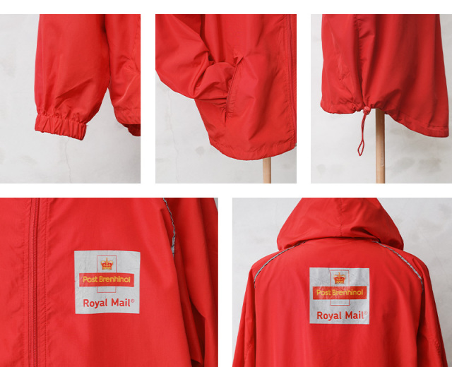 イギリスにおける郵便事業を担うRoyal Mail®(旧イギリス郵政公社)は、1516年 にヘンリー8世によって設立された郵便事業を営む国有企業です。ロイヤルの名が現在でもつきますが、現在では国の行政機関ではなく公社となっています。ワークアイテムとは思えないほどのデザイン性の良さで、一部のファッションユーザーから根強い人気を誇っています。 視認性のよい鮮やかなレッドカラーと、腕の付け根に沿ったシルバーのリフレクター、前後のリフレクター仕様のロゴが特徴的な一着。薄手のポリエステル素材で作られており、軽やかな着心地の一着です。 比翼仕立てのフロントはファスナーにて開閉。スタンドカラーにはフードが収納されており、急な天候の変化にも対応可能となっています。裾とフードはアジャスターによって絞り具合を調節可能です。ポケットは左右2ヶ所にファスナータイプのものが設けられています。 なかなか放出される事のない希少なアイテムですので、この機会に是非ご検討ください。 |