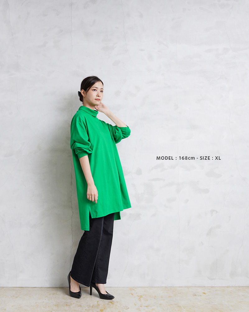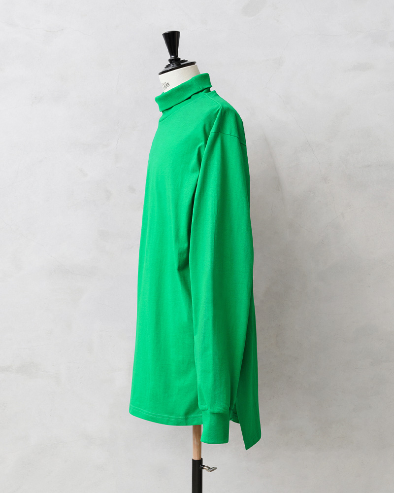 こちらは、そのシャツ(ジャージ)にあたるトップスで、首元は1回折り返すとベストなタートルネックで、サイドにスリットの入ったロングテールデザインが裾を出して着用するのにも最適なファッション性の高いデザインです。程よく厚手でUSAコットンのようなドライ感のあるさらっとした肌触りのコットン100%素材を使用しており、首元と袖先はリブ仕様で適度にフィットします。