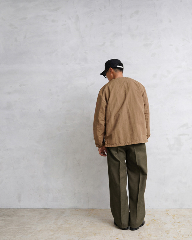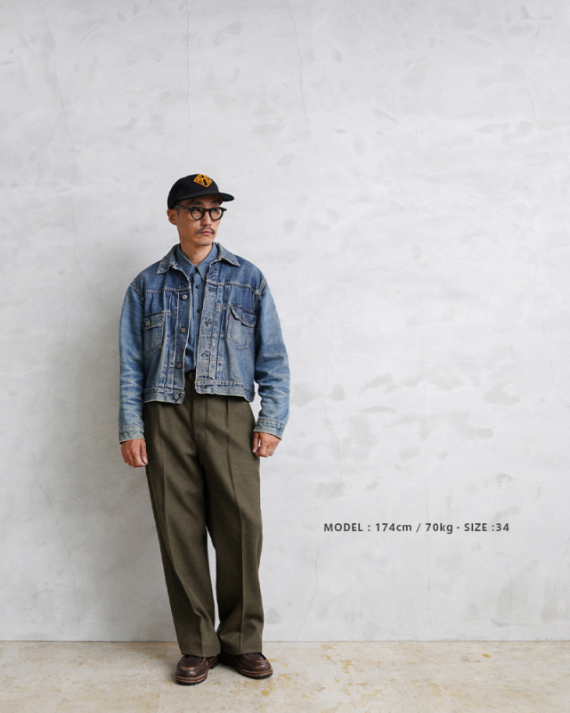 | 商品説明 | 実物 新品 デッドストック フランス軍 1950~60年代 M-52 ウエストカスタム ヴィンテージ ワンタック ウール トラウザーズのご紹介です。 フランス軍で不動の人気を誇る名品の「フランス軍 M-52 ヴィンテージ チノトラウザー」のウールバージョンがついに入荷しました!ワンタックとツータック仕様があり、こちらのワンタックはツータックよりも若干緩やかなテーパーシルエットで王道スタイルにもよりハマりやすい1本。 こちらは生産当時にフランスでウエストの後ろ中心に同素材のハギで4cmほどウエスト幅を広くカスタムされたアイテムになります。V字型のガゼットが追加されることで34のウエストで33のシルエットが楽しめるバランスの良い仕上がりです。 1950~60年代に製造されたアイテムで、ほんの少しブラウンが混ざったようなオリーブが無骨さもありながら品の良い色目で、ウール素材のパンツは保温性に優れており、抗菌・防臭効果もある素材です。センタークリースを備えることで縦にまっすぐ伸びたラインが強調され、上品さが際立ちます。 適度にゆったりとした裾にかけてのシルエットが秀逸で、ロールアップした際の雰囲気も非常によく、ウールサージの綾織りの上質なガシッとした素材感で風合い良く仕上がっています。深い股上にフロントはボタンフライ仕様、両サイドには使い勝手の良いスラッシュポケット、フランス軍らしいフラップ付きのバックポケットのディテールがタックイン時に際立ちます。 スニーカーやレザーシューズなどアイテムやコーディネート次第でカジュアルから、キレイめな着こなしにもマッチします。半世紀以上前のアイテムでありながら今回はデッドストックでの入荷!圧倒的に流通量が少なく、なかなか出回らないトラウザーズはコレクションにもオススメなスペシャルアイテムです! |