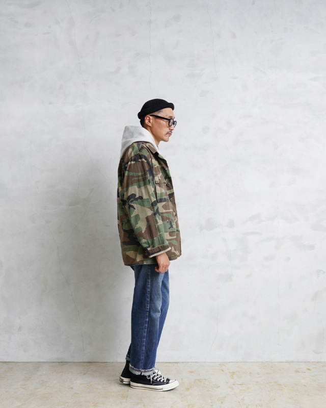 | 商品説明 | 実物 USED 米軍 BDU WOODLAND CAMO ジャケット 中期型 リップストップのご紹介です。 制式名称:COAT,HOT WEATHER WOODLAND,CAMOUFLAGE PATTERN,COMBAT 1981年より約30年以上にわたり全米軍で使用され、米海兵隊では2005年、米陸軍では2008年、米空軍では2011年、米海軍では2012年まで使用されたウッドランドカモ柄のBDU(野戦服)です。その後もアメリカ陸軍特殊部隊のグリーンベレーではウッドランドのBDUジャケットが限定で継続使用されていました。 こちらの中期型の特徴としては、1984年頃から1995年頃まで生産されたモデルで、胸ポケットのマチが外側に設けられており、襟の形状が中期型以降は小さくなり、袖口の調節用タブは前期、中期、後期になるにつれて幅広で短い形状へと変更されました。中期型にのみウエスト部分に調節用のアジャスターが付属しています。 BDUとは「Battle Dress Uniform」の略で、戦闘服のことであり、BDUジャケットの特徴とも言える4つのフロントポケットは2重構造のフラップがついており、ボタンが外に露出しない仕様です。4箇所のポケットはマチ付きで立体的なデザインになっています。フロントは比翼仕立てでボタンが引っかからない仕様、肘部分には補強のためにあて布がされた2重構造、袖はボタンで調節可能、左胸のポケットの内側にはペンホルダーが備わっており、細部にまでこだわり抜かれたデザインとなっています。 引き裂きに強く軽量ながら高強度という優れた素材のリップストップは1960年代半ば、BDU(戦闘服)への使用を目的に米軍で開発された生地で、ジャングル、砂漠等の熱帯地ゾーンでの通気性と強度を兼ね備えるために5~8mm間隔で格子状に織り込まれた生地で耐久性が高められ、洗濯などで縮むこともなく、シワにもなりにくいタフな素材です。 リップストップとノンリップは同じデザインでも雰囲気が変わりますので、その日の気分でお好みのタイプをセレクトして下さい。米軍のアイテムとして代表的なBDUジャケットですが、近年放出が少なくなり、年々希少価値が上がっており、入手することが非常に困難になってきたアイテムの1つです! 新品には出せない風合いのよい生地のアタリやムラ感などが、他と被らない1点物のような魅力を感じていただけると思います。これから更に着込んでいただくことにより様々な表情を見せてくれる1枚です。 |