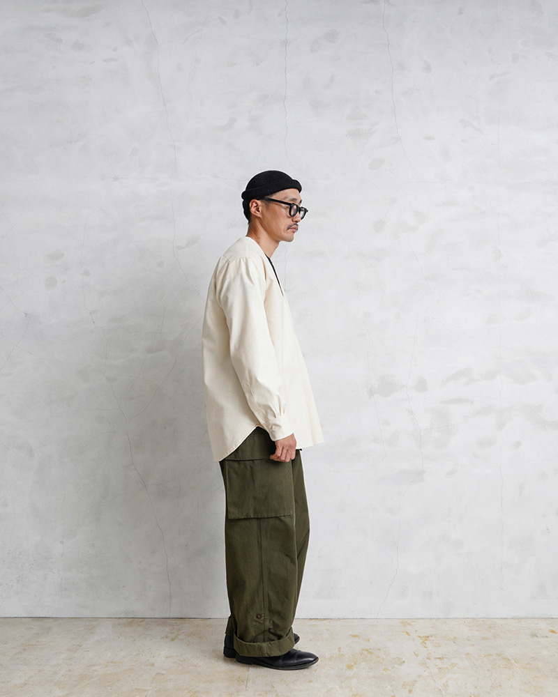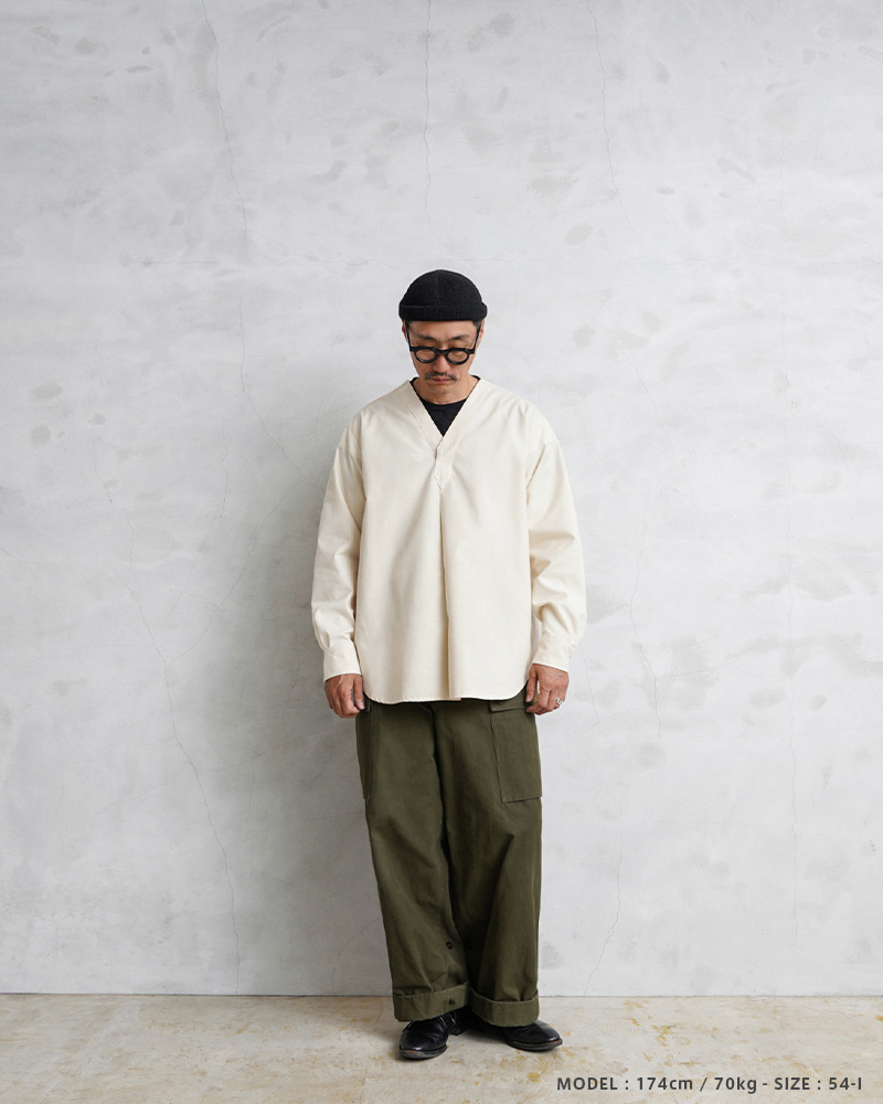 | 商品説明 | I.C.ORADEA社製 ルーマニア軍 スリーピングシャツ Vネック SLAB COTTON ナチュラルのご紹介です。 WAIPERでも販売経験のある「ルーマニア軍 スリーピングシャツ Vネック」をI.C.ORADEA社がナチュラルなコットンを使用して製造したスリーピングシャツです。I.C.ORADEA社はルーマニア西部トランシルヴァニア地方の都市オラデアに位置するルーマニア軍への納入実績もあるメーカーです。 ネップ感のあるコットンに染色を施されていない自然のままのカラーを活かして作られています。首元の特徴的なVネックに、フロントやバックのタックなども忠実に再現されています。 シルエットは身幅を広くとったボックスシルエットで、肩周りとヨークは同素材で2重に補強されています。ラウンドカットされた裾周りも着用時にバランスの良い印象になり、全体的にリラックス感のあるスタイリングに。 袖口はボタン留めでも、ロールアップしてもOKで、長い季節に男女問わず使える万能アイテムです。 |