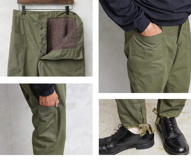 | 商品説明 | 実物 新品 デッドストック ルーマニア軍 コールドウェザー ブランケットライニング パンツのご紹介です。 密度が高くハリのあるコットン製のパンツの内側にブランケットに使用されるような素材を使用した1980年代を中心とした製造年代の保温性に優れたパンツが入荷しました。 裏起毛はウールや化繊などで作られた織物を、圧力をかけてフェルト状に加工し起毛させた生地は保温性が高く、過酷な気候でも暖かさをキープします。肌ざわりが良く耐久性にも優れている素材です。 着用した瞬間から暖かさを感じることができるふんわりとした着心地の良い生地で、チクチクする感じもなく、適度な厚みの裏地が使用されていますので見た目には形の良いテーパードシルエットです。 コットン素材のしっかりとした強めの生地に、フロントには2箇所のパッチポケットが付属しています。フロントはボタンフライ仕様で、人気のユーロミリタリーらしいシルエットが美しい一本です。 裾は紐で結んで調整できるようになっていて、フィット感を高める足掛けもついています。ファッションに落とし込んだ際もすごく使い勝手が良く、優秀で防寒性の高いミリタリーパンツです! |