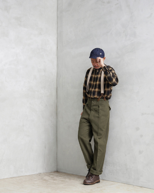 今回購入したサイズは24です。 前回は迷ってるうちに在庫切れになってしまったので再入荷通知が来てすぐに注文しました。 ウール素材なので穿いた時に若干チクチクします。 あとフロントのボタンの開閉がちょっとクセありますね。 硬い部分、外れやすい部分.....まあこれも味として受け入れます。 サスペンダーで腰の位置を調節し、2ロールアップで穿いてましたが後日裾直しをした際にダブルにて仕上げ直しました。 良い雰囲気ですよ! |