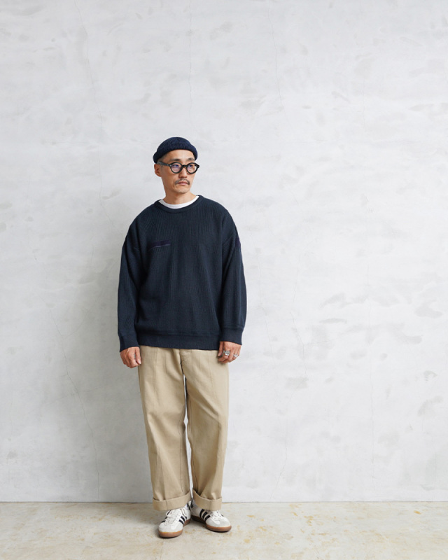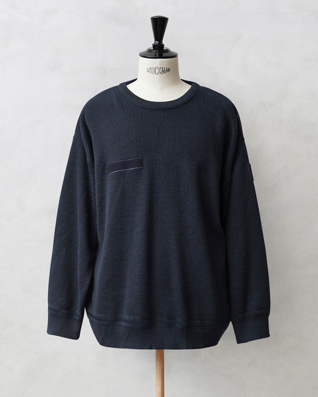 | 商品説明 | 実物 USED フランス軍 クルーネック ミドルゲージニット セーター ネイビーのご紹介です。 フランス軍より放出されたバランスの取れたミドルゲージニットを使用したセーターが入荷しました。 コマンドセーターのような肩のエポレットなどが付属していないシンプルなデザインなのでエポレットが苦手な方にもぜひおすすめしたいフランス軍が使用していたセーターです。 右胸と左袖に同系色のベルクロが付属していますのでミリタリーテイストはきちんと感じれる作りになっています。首元のクルーネックは目の細かいしっかりとしたリブ素材が使用されていますので適度に伸縮しながらも伸びに強い首周りになっています。 袖先と裾部分のリブの境目には編み方を変えることで独特な網目が特徴的。シンプルながら非常にデザイン性が高い1枚になっています。丁度よい厚みのあるミドルゲージは単体でもアウターのインナーとしても活躍しますし、1枚あると重宝し、とても着回しが利く万能アイテムです。 |