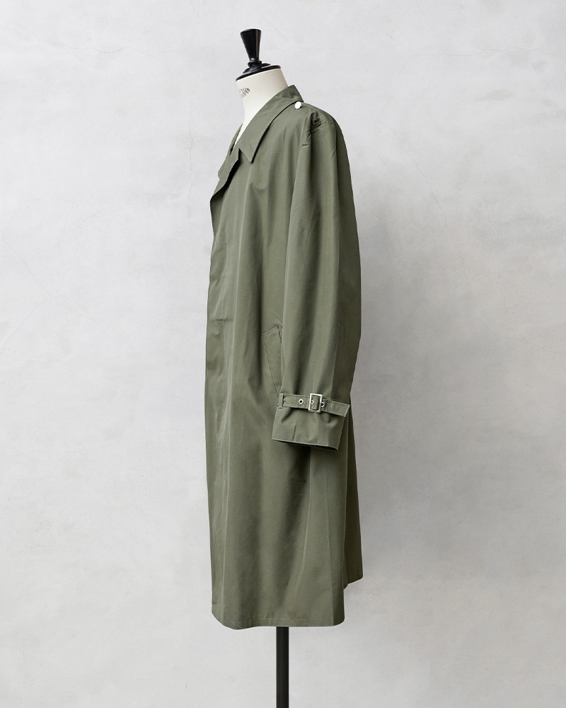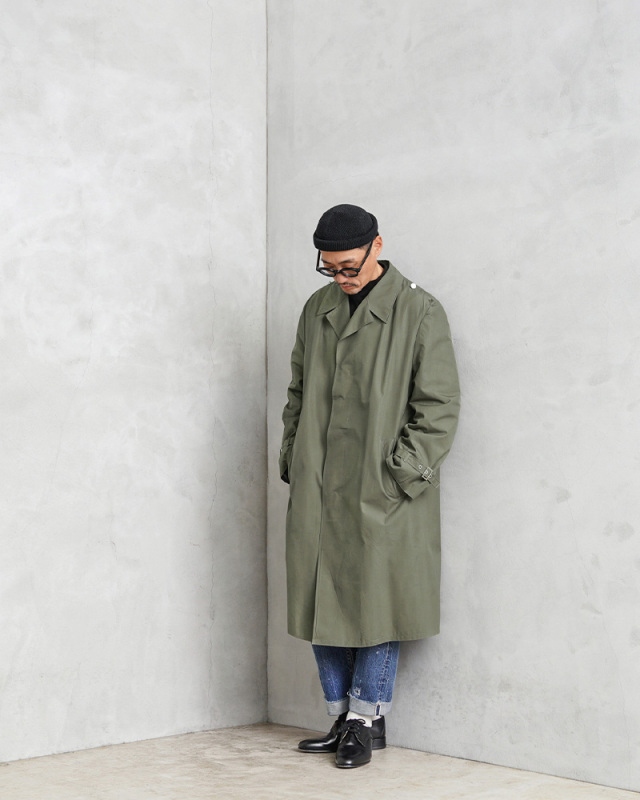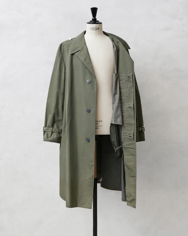 | 商品説明 | 実物 新品 デッドストック 東ドイツ軍 NVA レインコートのご紹介です。 1990年のドイツ再統一以前に東ドイツ軍(国家人民軍:Nationale Volksarmee)で使用されていたレインコートが入荷しました。NVAはNationale Volksarmeeの略称です。 表地は程よいハリ感のあるナイロンコットンのような素材に、裏地はポリウレタン(PU)のコーティングが施された素材が使用されています。雨の日に使用すると表面は多少水に濡れますが、中までは染み込みにくくレインウェアとしての役割を果たします。 フロントはボタン開閉の比翼仕立てのデザインで、袖先にはベルト付きで3段階の調節が可能です。内側の上半身と腕の内側にはさらっと通気性の良いメッシュ素材の裏地が取り付けられていますので袖通りも良く、斜めに配置されたサイドポケットは手の出し入れもしやすく、着心地の良さも考えられたデザインになっています。 エポレットは付属していませんが、肩章を取り付けるためのボタンとループが付属しています。落ち着きのあるオリーブカラーなのでレインコートとしてだけではなく、普段使いでも合わせやすく使える1枚です。 数十年デッドストックとして保管されていた、今後はもちろん入手困難になるアイテムです。 |