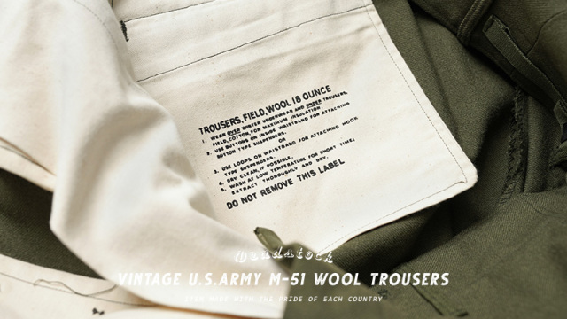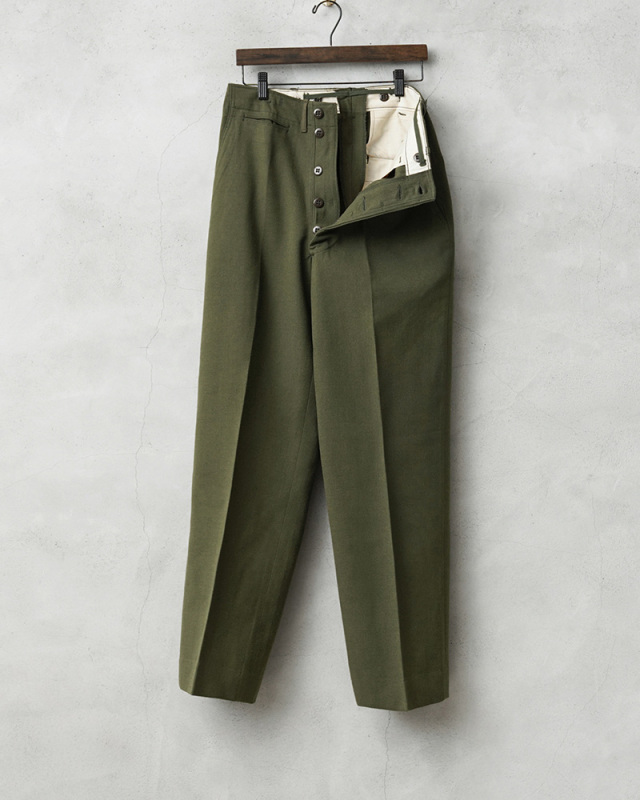 米陸軍において1951年に採用された18オンスの綾織りのウールサージ素材が使用されたODカラーのフィールドトラウザーズです。ノータック、太めのワタリ等、1950年代のクラシカルな魅力が満載のシンプルで上質な作りは、違いのわかる方にもきっとご満足いただける魅力的なアイテムです!