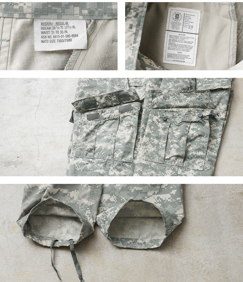 | 商品説明 | 実物 USED 米軍 ACU コンバットカーゴパンツ UCPのご紹介です。 制式名称:TROUSER, ARMY COMBAT UNIFORM 米陸軍の標準的な迷彩服として2004年から2019年まで採用されており、UCP迷彩(Universal Camouflage Pattern)が他の迷彩にない落ち着いた雰囲気をもつコンバットカーゴパンツが入荷しました。 UCP迷彩はそれまでの流線型のパターンに対し、ピクセル化されたマルチパーパステキスタイルと呼ばれています。デジタル技術の数値データをもとに解析された機能的な「デジタルカモフラージュ」は、現代的な迷彩パターンとして各国で広く採用されています。 米海兵隊で採用されていたMARPATのパターンを、様々な地形で目の印象に残らないように計算されたグレー基調にアップデート。ミニマルで都会的なグラフィックパターンは、現代のストリートの要素ともマッチするタウンウェアのデザインとして多くのブランドで取り入れられています。 ACUは「Army Combat Uniform」の略称で、BDU(Battle Dress Uniform)を踏襲したディテールに、斜めに配置されたカーゴポケットのフラップの形状や、膝部分にはパットを入れて膝を保護できるポケットなど機能性もアップグレード。また通称「8ポケカーゴ」と呼ばれるように、バック・サイド・カーゴ・膝下それぞれが両側に配置されているので収納性も抜群。特にカーゴポケットには中身が落ちないよう、間口にドローコードでストッパーが搭載されているなど機能性にも優れたおもしろいディテールが満載です。 生地にはM-65パンツから続くコットンとナイロン混合のリップストップ生地を使用しています。5~8mm間隔で格子状に織り込まれた生地で、引き裂きに強く軽量。洗濯などで縮むこともなく、シワにもなりにくいタフなファブリックです。 優れた機能性に、取り入れるだけでワンランク上のコーディネートが楽しめる魅力的なデザイン。近年放出が少なくなり、今後入手が困難になることが予想されるアイテムです。 |