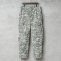 ACUは「Army Combat Uniform」の略称で、BDU(Battle Dress Uniform)を踏襲したディテールに、斜めに配置れたカーゴポケットのフラップの形状や、膝部分にはパットを入れて膝を保護できるポケットなど機能性もアップグレード。また通称「8ポケカーゴ」と呼ばれるように、バック・サイド・カーゴ・膝下それぞれが両側に配置されているので収納性も抜群。特にカーゴポケットには中身が落ちないよう、間口にドローコードでストッパーが搭載されているなど機能性にも優れたおもしろいディテールが満載です。生地にはM-65パンツから続くコットンとナイロン混合のリップストップ生地を使用しています。5~8mm間隔で格子状に織り込まれた生地で、引き裂きに強く軽量。洗濯などで縮むこともなく、シワにもなりにくいタフなファブリックです。