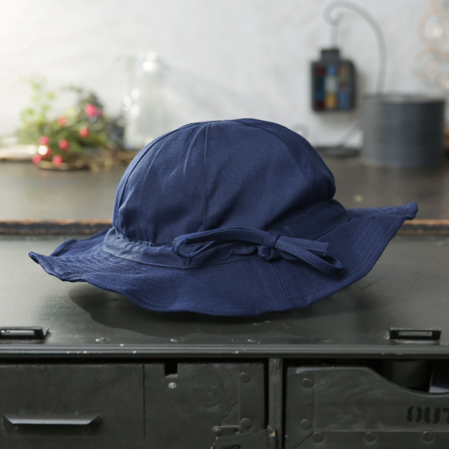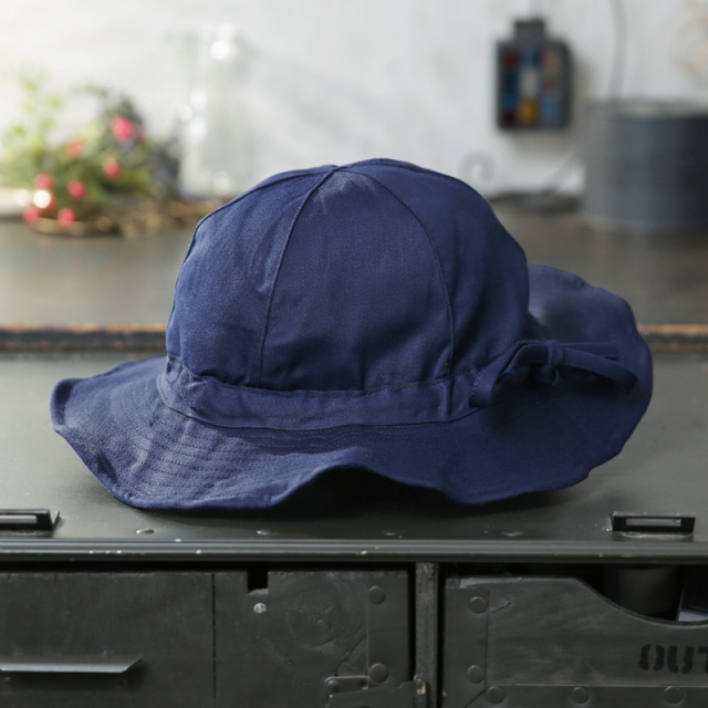 頭頂部の丸いデザイン等から、実際手にしてみるとユ-ロらしいゆとりを感じるハットです。やはりブルー系の服と相性が良く、いいアクセントになります。