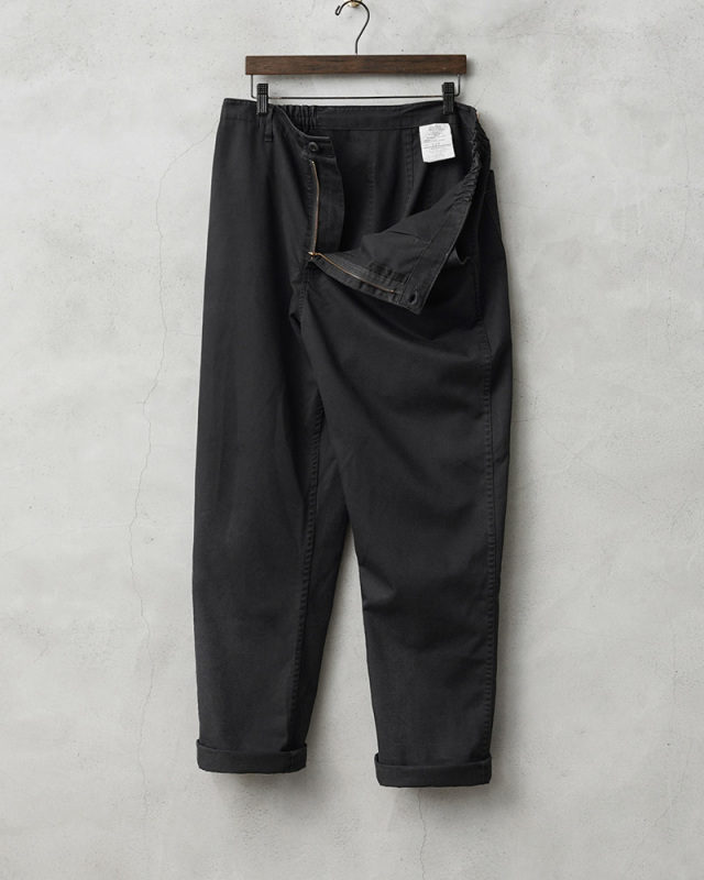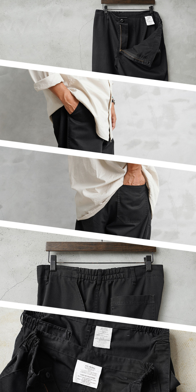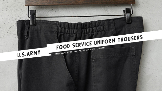 | 商品説明 | 実物 USED 米軍 FOOD SERVICE UNIFORM(フードサービス ユニフォーム)トラウザーズのご紹介です。 制式名称:TROUSER FOOD SERVICE UNIFORM 米軍の基地内の食品に関連した部門で使用されていたトラウザーズです。 2010年代に採用されたアイテムで、綾織りされた丈夫なT/Cツイル生地が使用されています。T/Cツイルは速乾性に優れ、シワになりにくく、タフな素材感で、汚れにくく使いやすいブラックが用いられています。 トップボタンにはファティーグボタンが使用され、ジッパーフライが採用されています。サイドのウエスト部分がゴムで適度に伸縮しますので、立ったり座ったりする際にもウエストに負担がかからず快適に着用できます。フロントポケットは斜めにデザインされたスラッシュポケットが使いやすく、バックポケットもシンプルなパッチポケットが付属しています。 程よくゆとりのあるテーパードシルエットが着用時に綺麗なラインのパンツとして重宝します。ウエストゴムやサイドステッチ部分にはアタリが出て雰囲気も良いユニセックスで使えるトラウザーズです! |