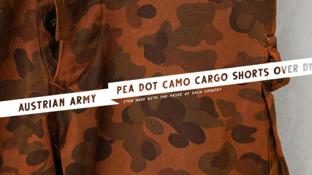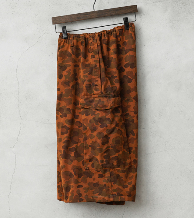 | 商品説明 | 実物 USED オーストリア軍 リメイク ピードットカモ カーゴショーツ ORANGE染め ウエストドローコード付きのご紹介です。 オーストリア軍のカーゴパンツを使用した春夏に活躍する存在感のあるカーゴショーツが入荷しました! オレンジカラーにオーバーダイ(後染め)がされていますが、放出された後にヨーロッパ本国で製品染めが施され、ショーツにリメイクされ入荷したアイテムです。独特なカモ柄と相性良く個性的な色目に仕上がっています。 1957年に採用された「PEA DOT CAMO / ピードットカモ」は、第2次世界大戦時のドイツ軍で採用されていた迷彩パターンの「ERBSENMUSTER CAMOUFLAGE / エルブセンムスターカモフラージュ」の初期デザインから影響を受け、その後オーストリア独自で開発されたカモ柄です。1970年代まで採用され、様々なバリエーションのあるパンツです。 こちらは60年代以降に採用されたモデルで、フロントはボタンフライ、サイドポケットは貫通式で、カーゴポケットはボタン開閉のマチ付きで立体的な仕様です。カーゴポケットのフラップとは別に金属製のファスナー付きで、ウエスト部分にはコットン製のドローコードで調節できる仕様になっています。コットンサテン生地が使用されていますので、着込むほどに風合いの良い経年変化も楽しめる素材です。 シンプルになりがちな春夏コーデのアクセントにぴったりなカラーで、入手困難なパンツをリメイク&後染めされた贅沢なショートパンツです。 |