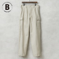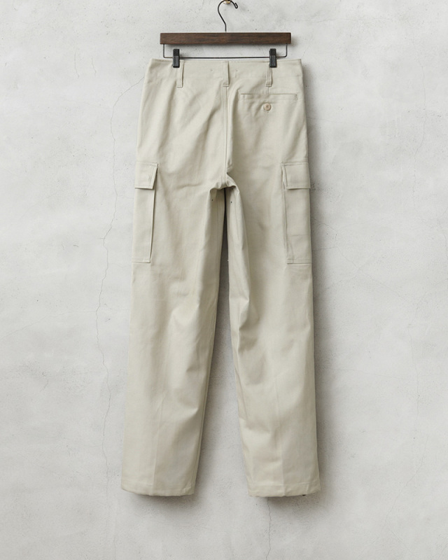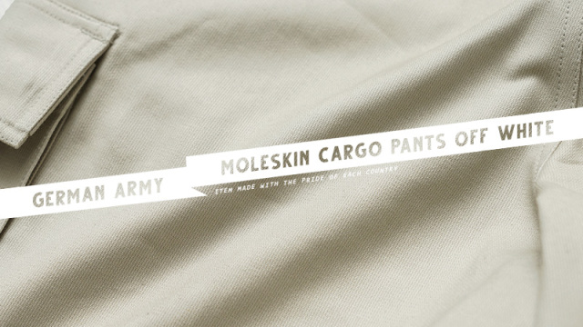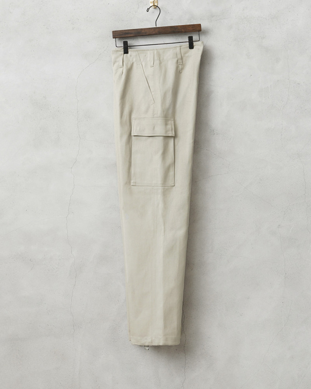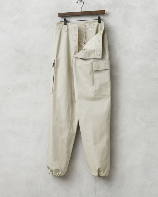 | 商品説明 | 実物 新品 デッドストック ドイツ軍 モールスキン カーゴパンツ オフホワイト コンディションBのご紹介です。 ドイツ軍の名作と名高いモールスキンカーゴパンツのオフホワイトバージョンが入荷しました! カーゴパンツ特有の野暮ったさはなく、きれいなシルエットが魅力で、テーパードが効いたシルエットは普段着のコーディネートに取り入れやすい洗練されたシンプルなデザインです。アイボリーのようなグレーがかったオフホワイトが印象的なカラーで、1990年代まで使用されていたカーゴパンツです。 ヴィンテージのフレンチワークアイテムなどによく使われているモールスキン素材ですが、モールスキンは、太い綿糸を生地の片面だけではなく、両面に起毛させながら織り上げています。mole(モグラ)skin(肌)という意味でもともとはモグラの毛皮を指していました。 丈夫な綿素材と言えば、キャンバスやデニムがよく使用されていますが、実は最も丈夫なのが、このモールスキンと言われています。織りの密度が高く、耐久性にすぐれたやや厚手のコットン生地は使い込むほどに風合いが増し、長く着用していただける堅牢性の高い素材です。 こちらはミリタリートラウザーの中でもとりわけ希少な存在とされているカーゴパンツで、フロントはボタンフライ、バックポケットは1つ、サイドカーゴポケットはボタンタイプ、裾にはドローコードが入っています。内側にはサスペンダーボタンが付属しています。 股下にはベンチレーションの役割を果たすホールも備わっています。ミリタリーならではのディテールでありながらもモールスキン素材が他とは違う独特な存在感を放ち、スマートに着用していただける多くのブランドからもサンプリングされてきたパンツです。 アタリや経年変化の表情が素晴らしい素材なので、穿き込む度に柔らかくなる質感も楽しめます。今や完全に市場から姿を消しつつある希少なモールスキンカーゴパンツのさらにレアなオフホワイトです!お見逃しなく! |