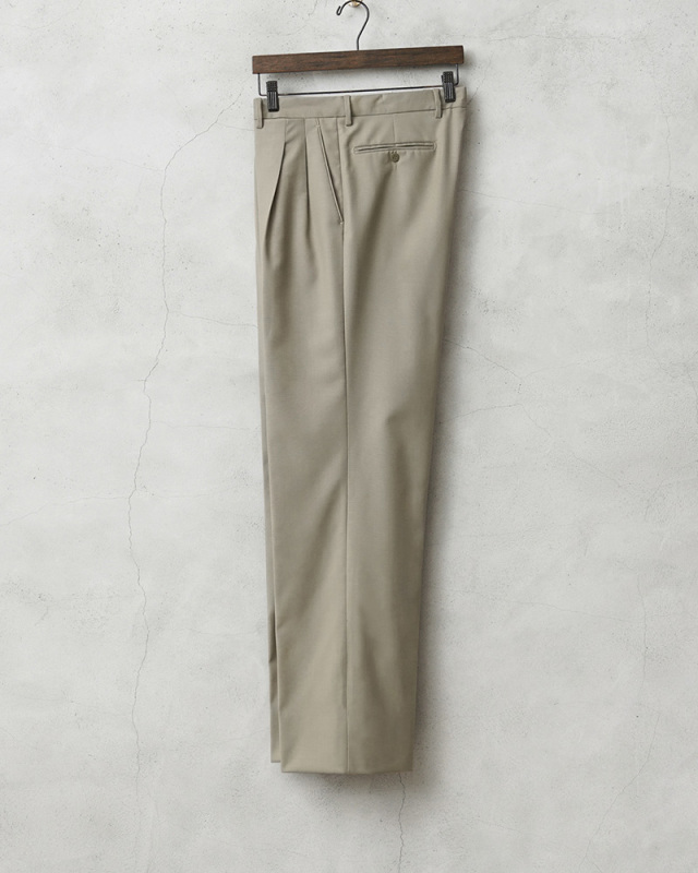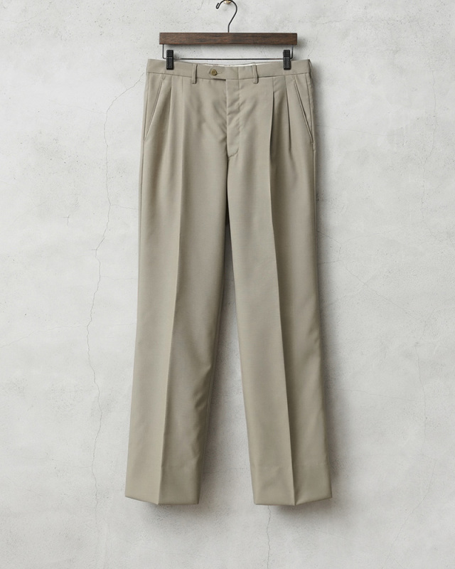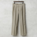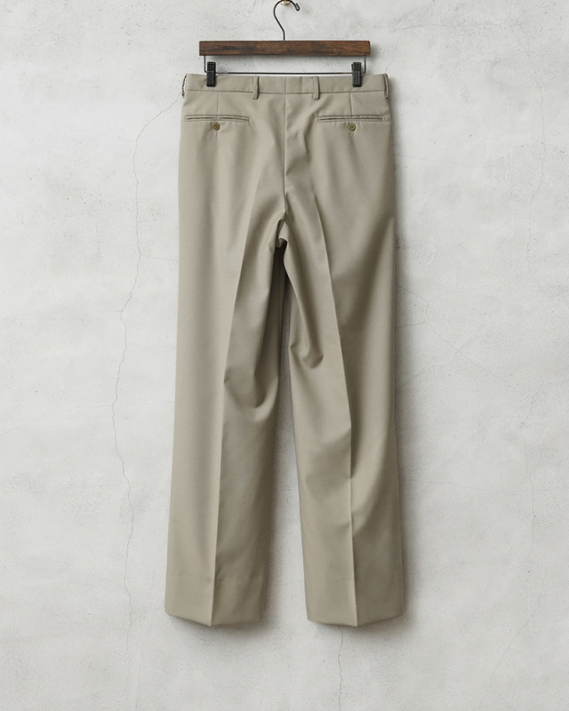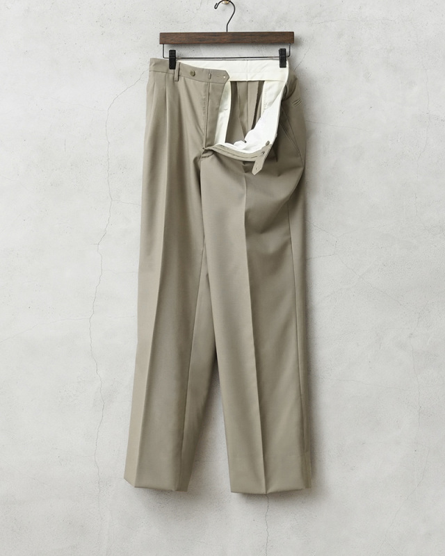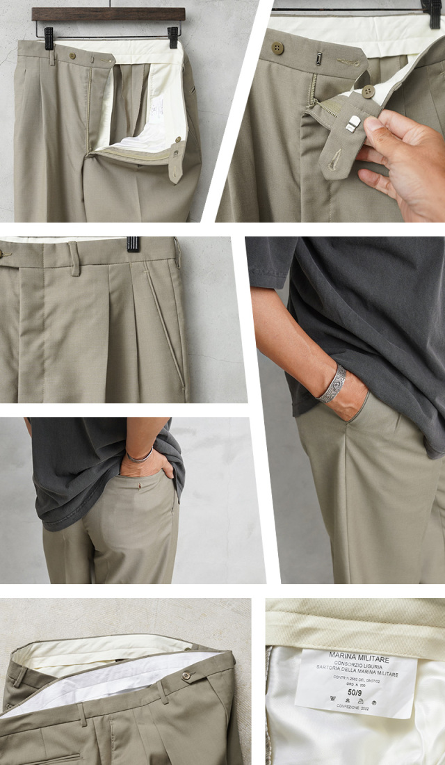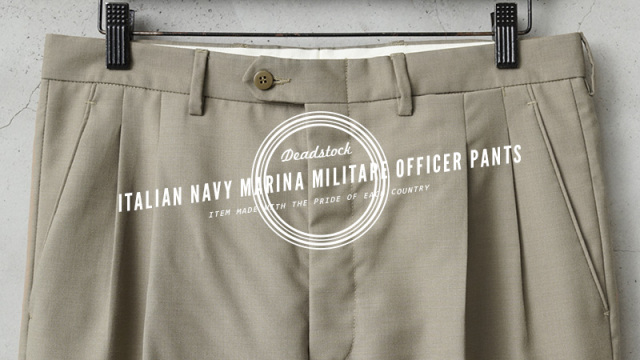 | 商品説明 | 実物 新品 デッドストック イタリア軍 MARINA MILITARE ツータック オフィサーパンツのご紹介です。 イタリア海軍(Marina Militare)で採用されていたオフィサーパンツが入荷しました。 春から秋にかけての暖かい季節に使用されていたオフィサーパンツで、ホワイトなどのカラーのパンツと用途によって使い分けられていました。グレーとベージュの中間のGREIGE/グレージュと呼ぶのが最も近い色目です。 ウール、ポリエステルブレンドの生地を使用し、ウール特有のストレスを感じることはなく、強撚糸(強く撚った糸)が使用された、さらっとした肌触りで通気性が高く、シワになりにくい織物が使用されています。 ツータック仕様で、シンプルな見た目の中にもウエスト周りに程良いゆとりを出したリラックスして履けるシルエット。フロントは使いやすいジッパーフライ仕様で、ポケットは手の出し入れしやすい斜めに配置されたスラッシュポケット、バックポケットはボタン留めの両玉縁ポケットが採用されています。ウエストの左側にはさり気なくウォッチポケット(コインポケット)がデザインされています。 太ももから膝の辺りまで滑らかなポリエステル系の裏地が付けられていますので快適な穿き心地。グレージュのスモーキーカラーが着回しやすく、幅広い着こなしができるストレートシルエットの高品質なトラウザーズです。 |