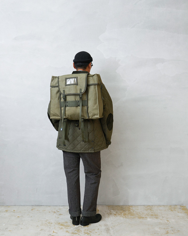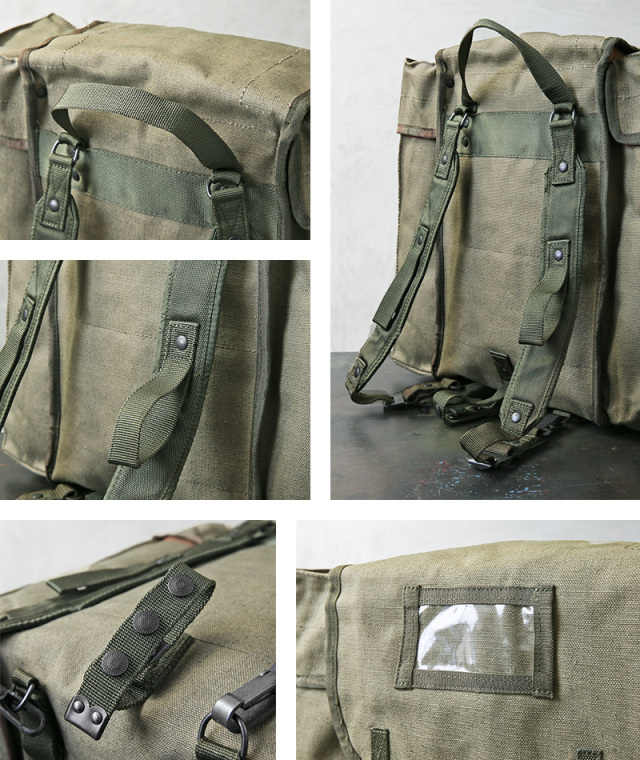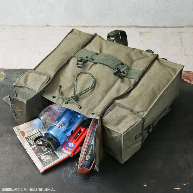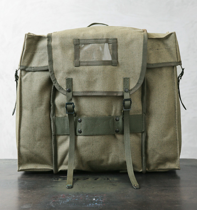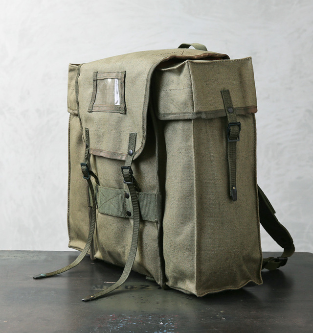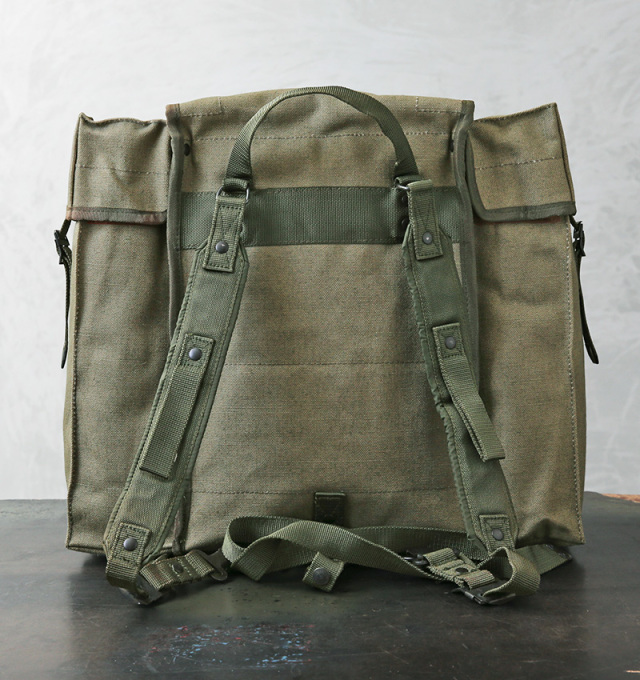 実物 新品 デッドストック イタリア軍 コットンキャンバス バックパックのご紹介です。 イタリア軍から風合いの良いキャンバス生地のバックパックが入荷しました 70年代頃、イタリア軍の中でも非常に強靭と言われている山岳部隊で使われていたラックサックと同じソリッドで角ばった形状。 しっかりと織られた厚手のコットンキャンバス製で、内側は防水ビニールの裏地が貼り付けられています。 メイン、サイド共に3つのフラップ付きのコンパートメントがあり、たっぷり入る容量を備えています。 バッグの底部分には調整可能なウェビングベルトが付属し、キャンプや山登りに重宝するブランケットやシュラフなどを固定できる設計。 アウトドアではもちろん、本などの重さにも耐えうる耐久性があり通勤通学用バッグとしても活躍します。 経年変化も楽しみなコットンキャンバス生地に、各所のウェビングベルトや軍用の光を反射しないリベットボタン。シンプルながら使うほどに愛着の湧く希少なサープラスアイテムです。 |