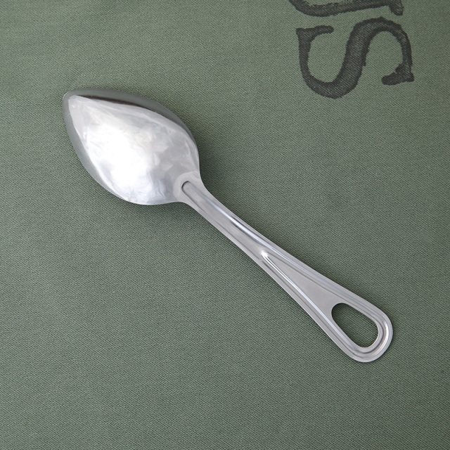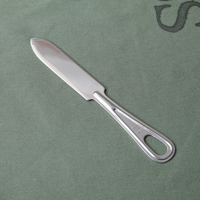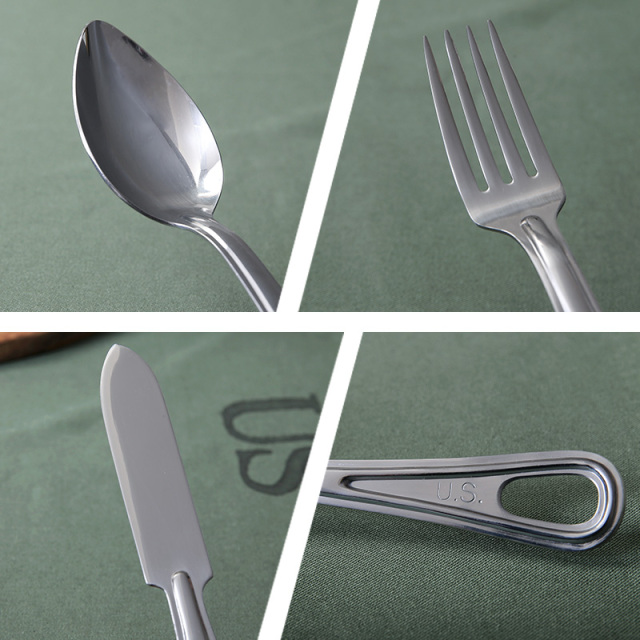 実物は近年、軍でも使い捨てのプラスティック製が主流になってきてますので、ますます手に入りにくくなっていますが、こちらは忠実に再現されたアイテムです。 ハンドル部分に空いた穴に紐やカラビナなどを通してまとめることが可能で収納や持ち運びに便利です。ご自宅での使用はもちろんのこと、キャンプなどで雰囲気を楽しむのもおすすめです。 ワンポイントでUSステンシルが入り、シルバーのステンレスの素材感と相まってとても良い雰囲気になっています。シンプルなデザインとサイズともに非常に使いやすく、長くご愛用いただけます。 MADE IN JAPAN ※撮影に使用した小物は付属しません。 |