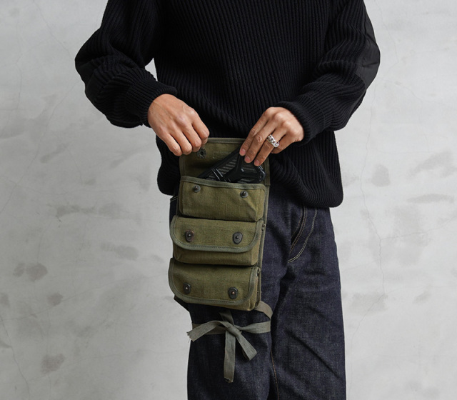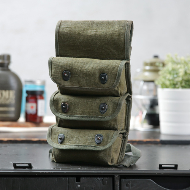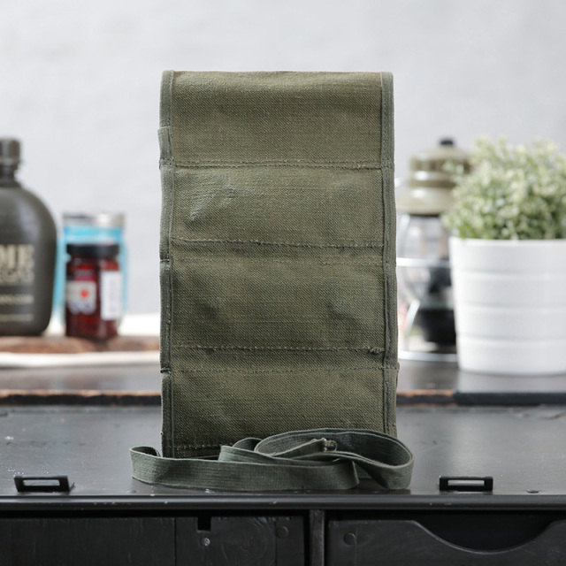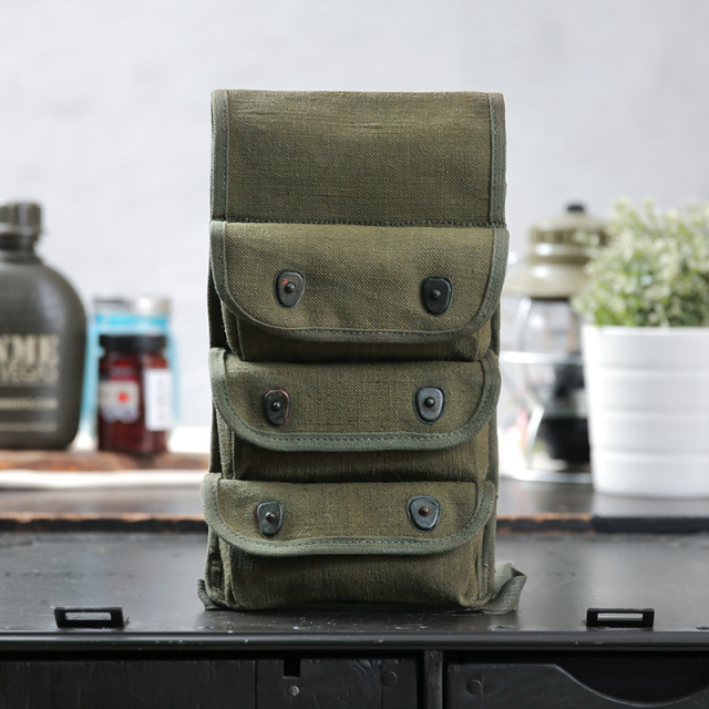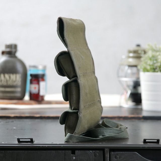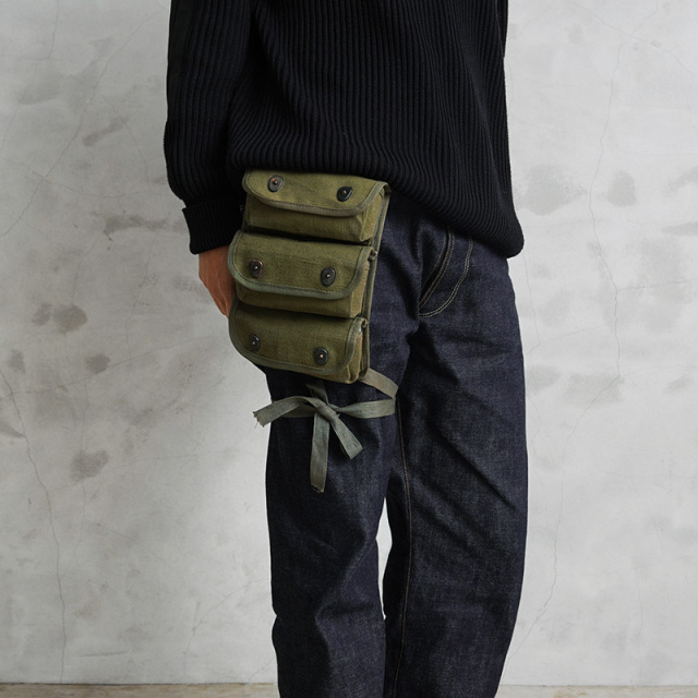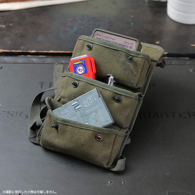 | 商品説明 | 実物 USED フランス軍 3セル ハンドグレネードポーチのご紹介です。 制式名称:French hand grenade pouch フランス陸軍で使用されていた3段式の手榴弾ポーチが登場。 第二次世界大戦中~ベトナム戦争前後、米国製の装備を真似てフランスで造られた機能的なベルトポーチ。 危険な手榴弾を入れることを想定し、丈夫なコットンキャンバス製で、引っ張っても簡単には外れない“LIFT-THE-DOT”ファスナーで固定された3つのポケットが特徴となっています。 幅7cmまでのベルトにフィットするベルトループ、脚の周りに固定する2本のタイテープが備わっています。 ベルトポーチとしてはもちろん、ベルトループにタイテープを通してクロスし、上部で結ぶことで壁掛け収納や持ち運び用アイテムとしても重宝します。 戦時下の使用を考えられた堅固な作りと雰囲気、小物収納に普段遣いしやすいサイズ感。 ポーチバッグとして、ミリタリー感あふれるコーディネートのアクセントに。ウォールポケットのような使い方で、インテリアやお店の什器にもオススメのアイテムです。 ※撮影に使用した小物は付属しません。 |