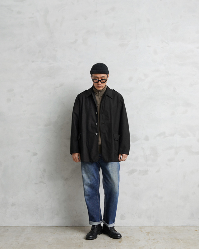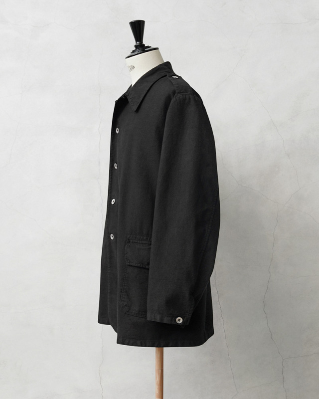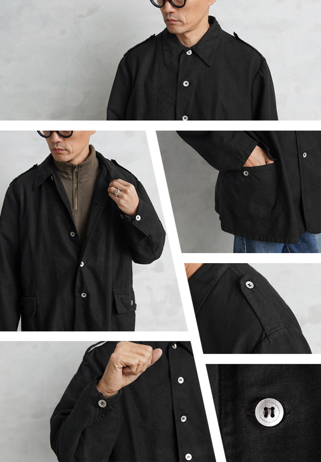 | 商品説明 | 実物 USED スウェーデン軍 M-39 ユーティリティー ワークジャケット BLACK染めのご紹介です。 スウェーデン軍特有のグリーンカラーのユーティリティーワークジャケットが誕生する以前に採用されていた非常に希少なアイテムを染め職人に丁寧にBLACK染めしていただきました。BLACKにする事でかなり良い雰囲気になり、着込むことでさらに風合いの増す1枚です。 Overdragsrock(オーヴァードラグスロック)という独自の名称で呼ばれるユーティリティージャケットで、仕様や状態も様々でまさに1点物と言える雰囲気を醸し出すヴィンテージアイテムです。 シャツジャケット感覚で着用できる生地感のコットンツイル素材でフロントのサイドにはフラップポケットが備わっています。フロントはボタンで開閉でき、メインに使用されているメタルボタンが年代の古さを感じさせます。 ウール生地の軍服が主流だった時代に作業服として生まれ、時に簡易の夏季用戦闘服としても利用されました。 味のある使用感、ワークジャケットらしいシンプルなデザインと綺麗なシルエットが魅力の1枚です。 羽織るだけでOKなコーディネートを選ばずに着用していただける汎用性が高いアイテムです。 |
