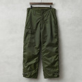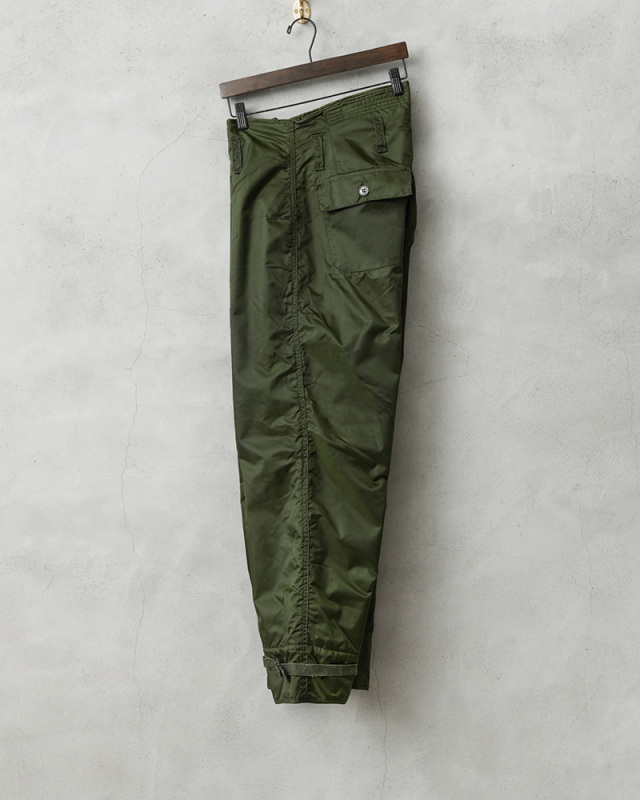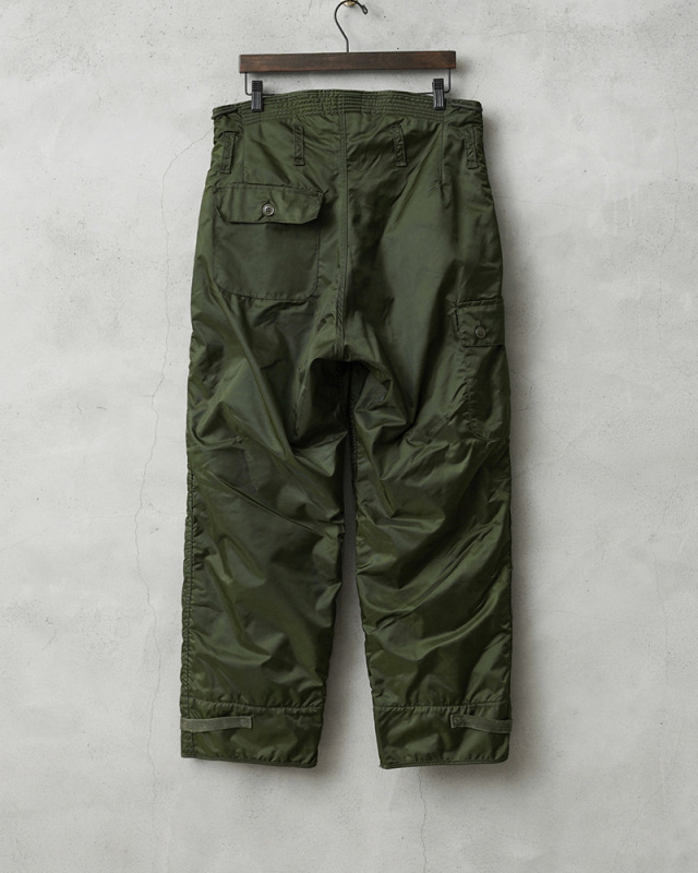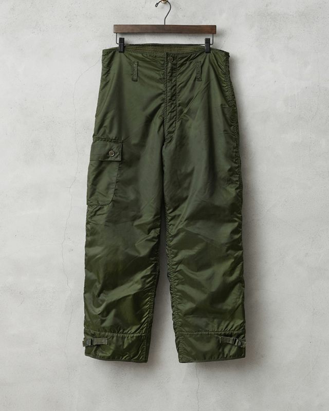 | 商品説明 | 実物 USED 米軍 U.S.NAVY EXTREME COLD WEATHER IMPERMEABLE デッキパンツのご紹介です。 制式名称:TROUSERS,EXTREME COLD WEATHER,IMPERMEABLE 1970~80年代を中心に米海軍(U.S.NAVY)で使用されたナイロン製デッキパンツです。 極寒の海上での作業を想定しているため、表地には耐久性&耐水性&防寒性に優れたナイロン素材が使用され、ライニングにはナイロンパイルやナイロンフリースと呼ばれる特殊な起毛加工が施されていますので、保温性を高めたダブルフェイス仕様は足を通した時の気持ちよさが格別です。 右サイドにフラップ開閉のカーゴポケットが付属、バックポケットは左側にフラップポケットが付属、裾にはアジャスター付きで風の侵入を抑えることのできるディテールになっています。 襟がコーデュロイ素材の「EXTREME COLD WEATHER IMPERMEABLE デッキジャケット」のパンツに該当するデッキパンツで、1960~70年代前半に採用されていた襟がナイロンのA-1デッキジャケットの下に着用するA-1デッキパンツには「TROUSERS,EXTREME COLD WEATHER(IMPERMEABLE A-1)」とラベルに記載がされていました。それぞれのパンツの仕様はほぼ同じと言えるぐらい共通点の多いデッキパンツです。 股上の深い仕様ですのでバイクに乗られる方はウエスト部分に風が入りにくく、オーバーパンツ感覚でも着用いただけるデザインです。引き手の大きな真鍮製ブラスジップを使用し、ウエストのベルトループと共に付属する2箇所のサイドのループは「米軍 M-50 トラウザーズ サスペンダー」をループに引っ掛けて着用することも可能です。 釣りやライディング等のアウトドアからカジュアルまで幅広く着こなせる便利なデッキパンツです。 希少価値が高く中々出てこないアイテムです。 |