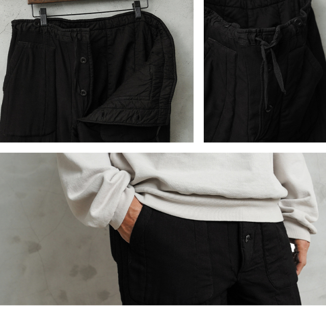 | 商品説明 | WAIPER.inc 実物 USED チェコ軍 M-60 ライナー リメイク パンツ ポケット付き BLACK染め のご紹介です。 チェコ軍より放出されたパンツライナーをさらに使いやすいように、雰囲気の良いパッチポケットとバックポケットをデザインしてリメイクを施しました。 そして今回は元々ODだったパンツを、染め職人に丁寧にBLACK染めしていただきました。コーディネートに合わせやすいブラックカラーはより良い雰囲気になり、着用回数を重ねる事に風合いが増していく一枚です。 1960年代に支給が始まったM-60(Vz.60(Vzor 60)とも呼ばれるシリーズ)で同じM-60シリーズのレインドロップカモフラージュ・パンツとセットで採用されていたアイテム。生地は厚手ながら柔らかいコットンで、中綿入りのため保温性に優れています。 ウエストはコード内臓で絞ることができ、サスペンダー用のボタンを4つ備えています。裾はリブになっていて、体温を逃しにくい仕様になっています。 中綿入りのパンツライナーに3箇所のポケットを付けることで使い勝手の良いデザインになりました!特にバイクに乗る方やアウトドアにもおすすめです。WAIPERでしか手に入らないリメイクのパンツライナーです! |